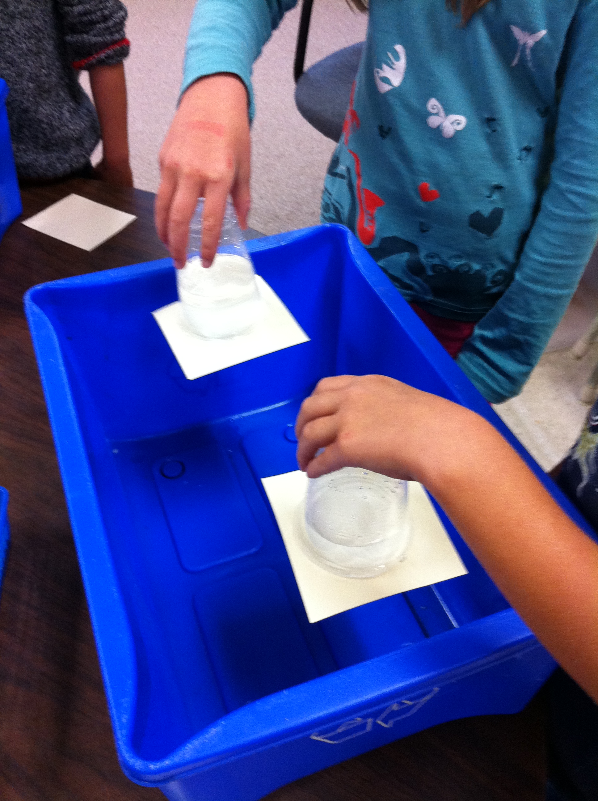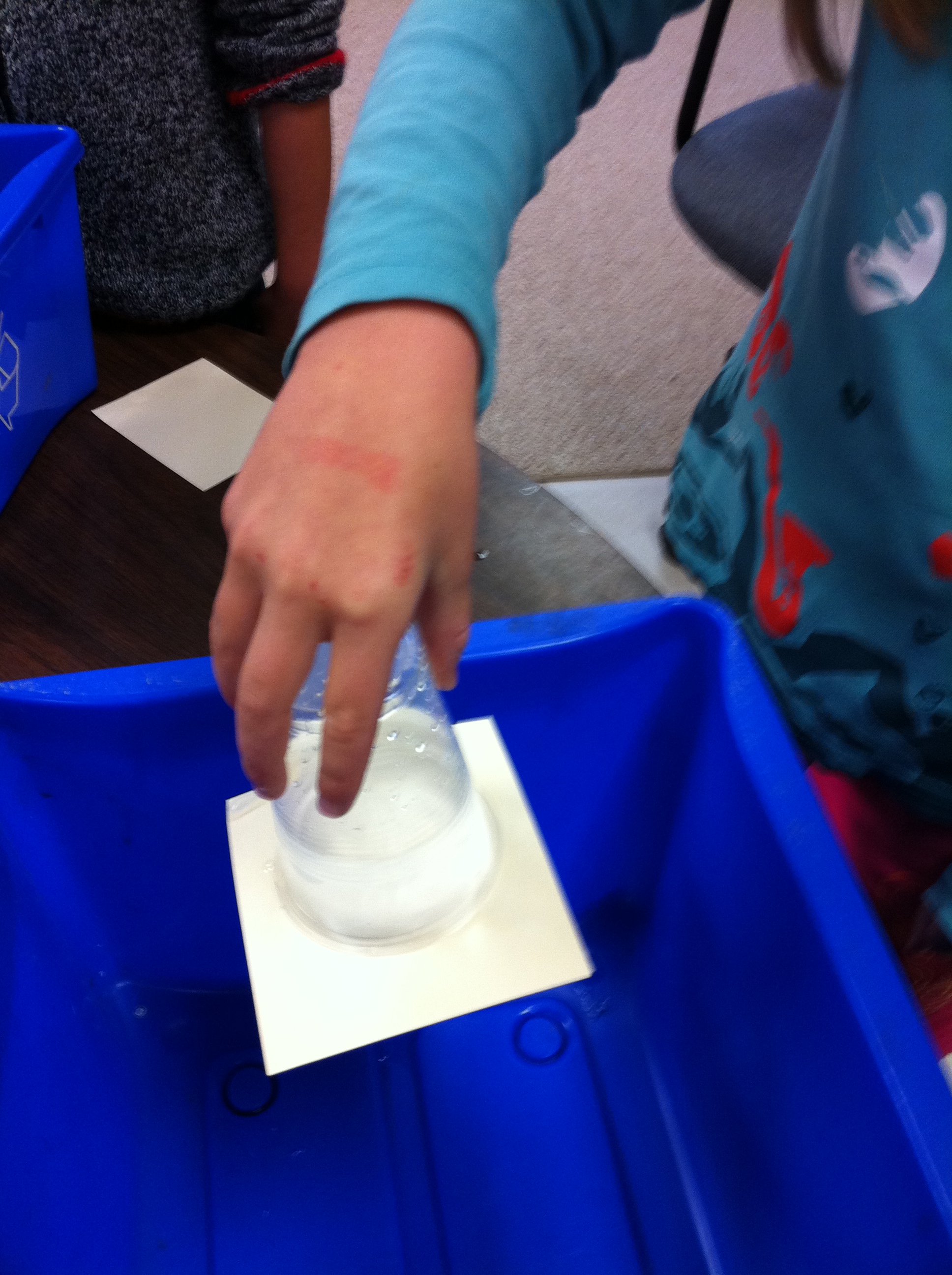 Last week we also did the one about air pressure. I have to admit it is really fun to see the children’s faces every time I demonstrate this experiment. It’s the one where you put a piece of cardboard on top of a glass half full of water, carefully turn it over keeping your hand very flat. You take your hand away from the cardboard and amazingly the water stays in the cup! It really seems like magic! The magic of air pressure!
