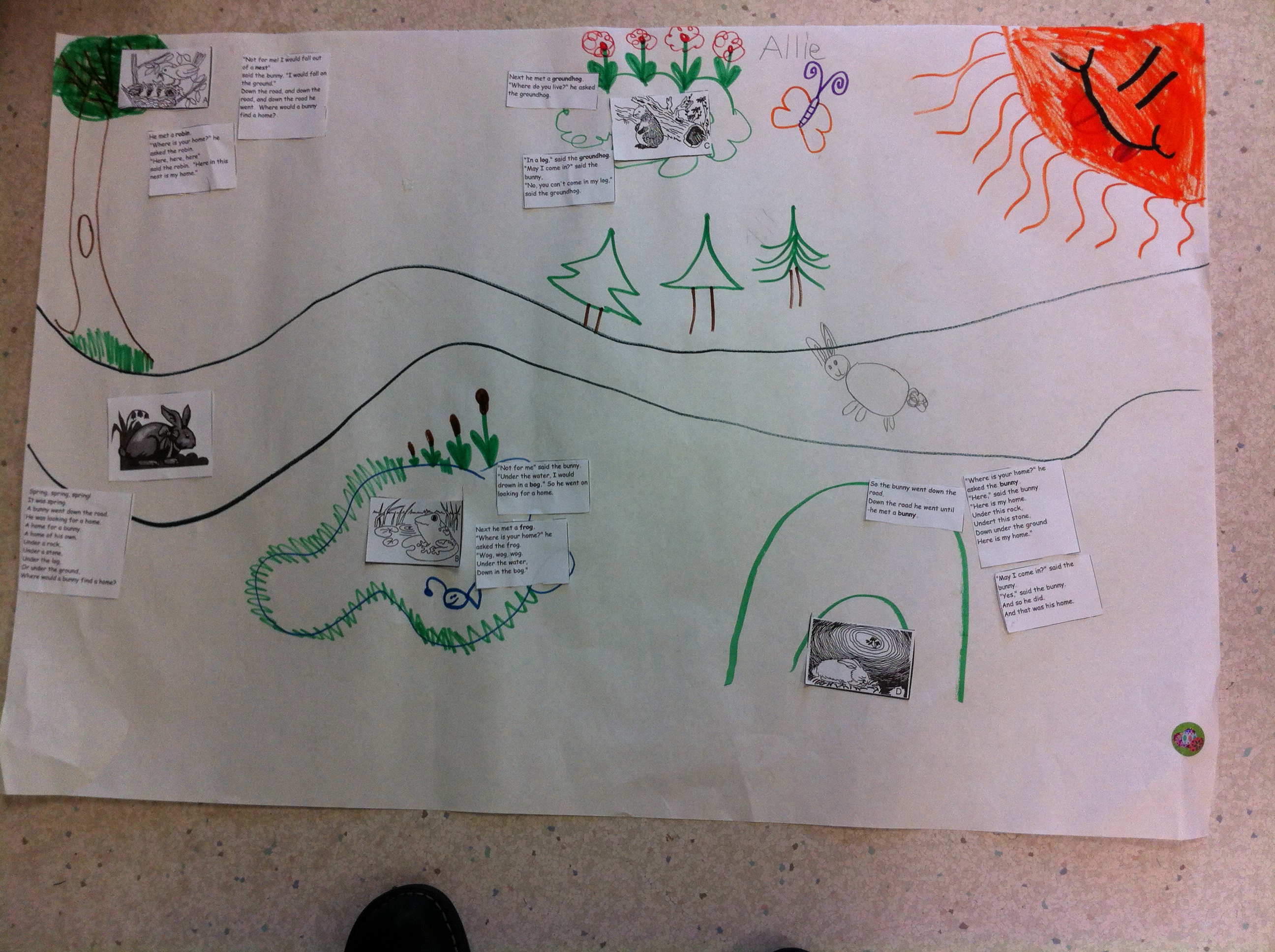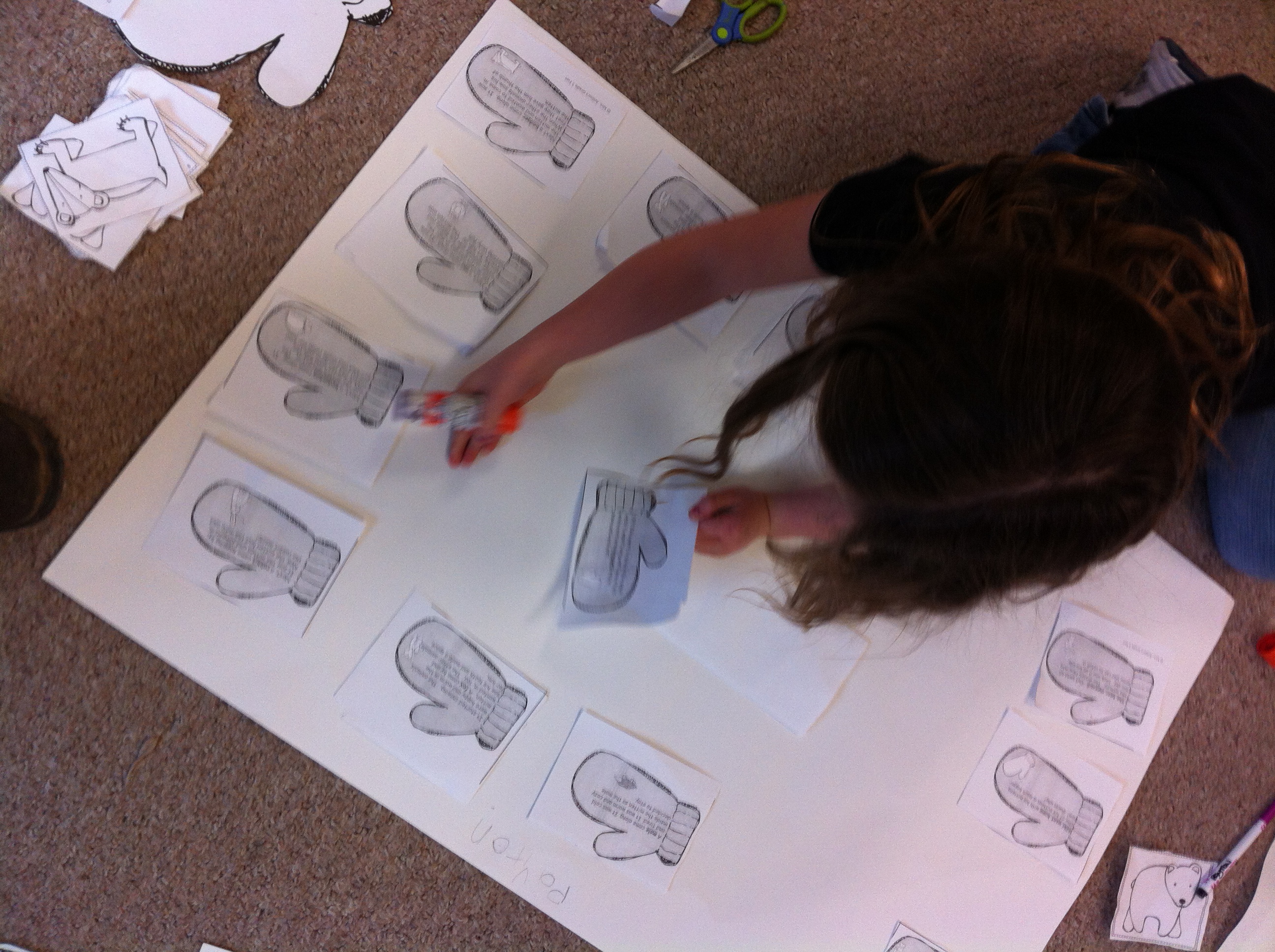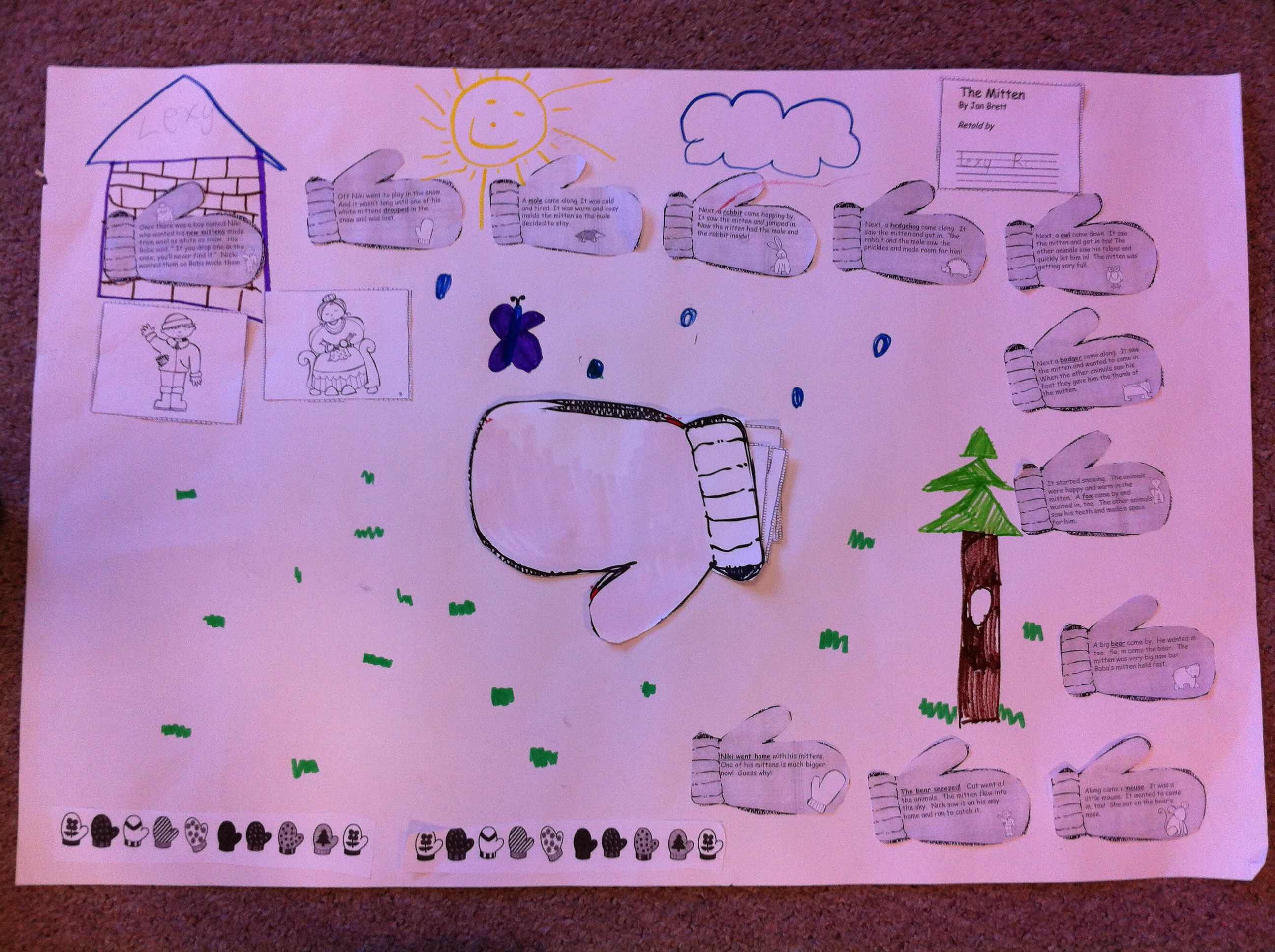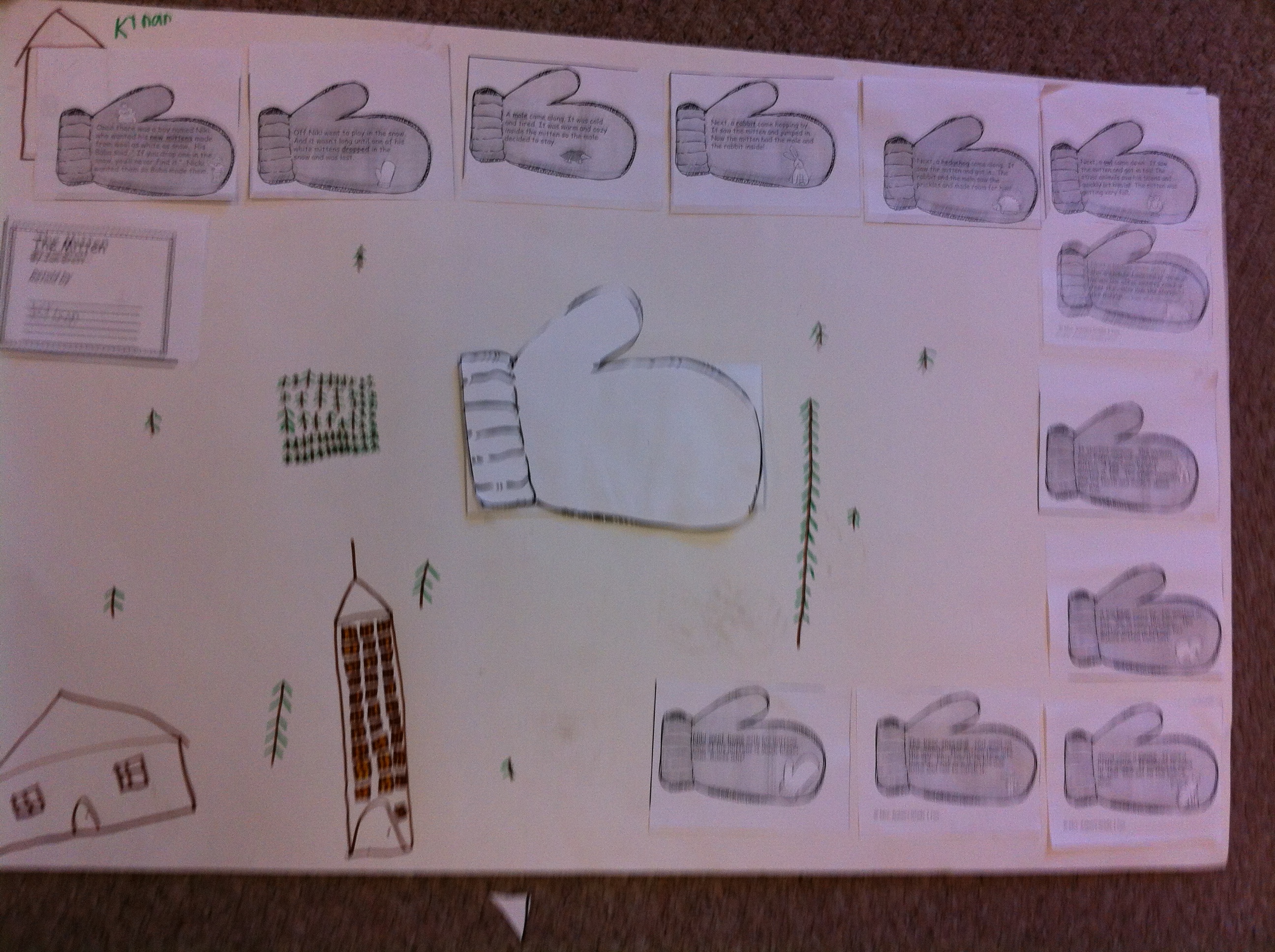 Last Friday we did a story map. We read the story The Mitten by Jan Brett and then the children retold the story by creating a story map. They seemed to really enjoy putting it all together. I think they especially liked licking the envelope , sealing it, and then cutting it open at the end to make the secret compartment for the animals to disappear into behind the mitten picture! Hopefully, they shared it with you.