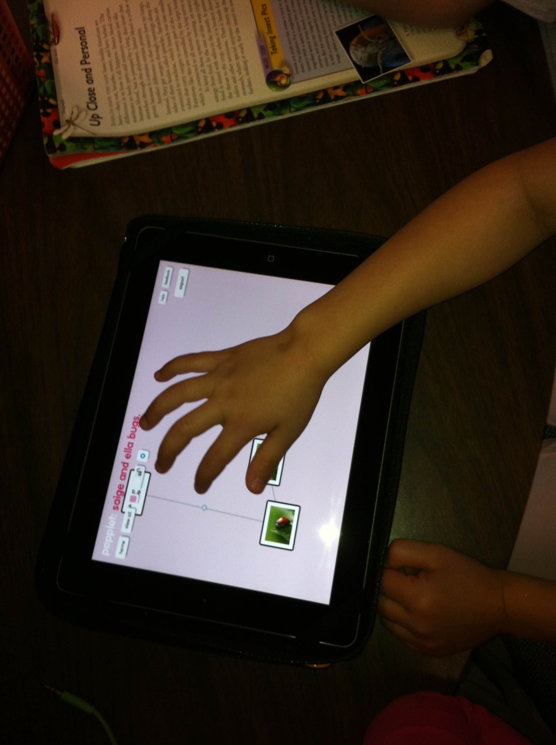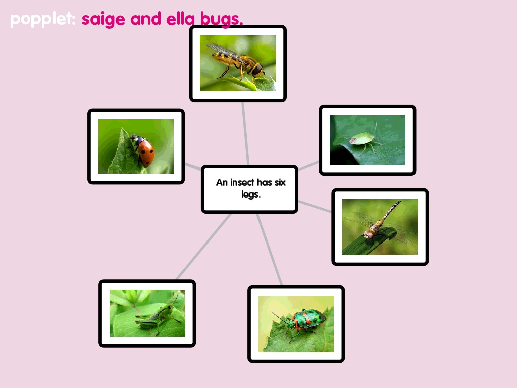 To create the web they started with one popplet and added an appropriate text to define their web. Then they had to add six popplets with an insect in each. They had to create the popplet and then choose to add a picture, find the picture in the camera roll and add it to the popplet. I did a quick 10 minute demo and then had some children work with a partner to create the first ones!