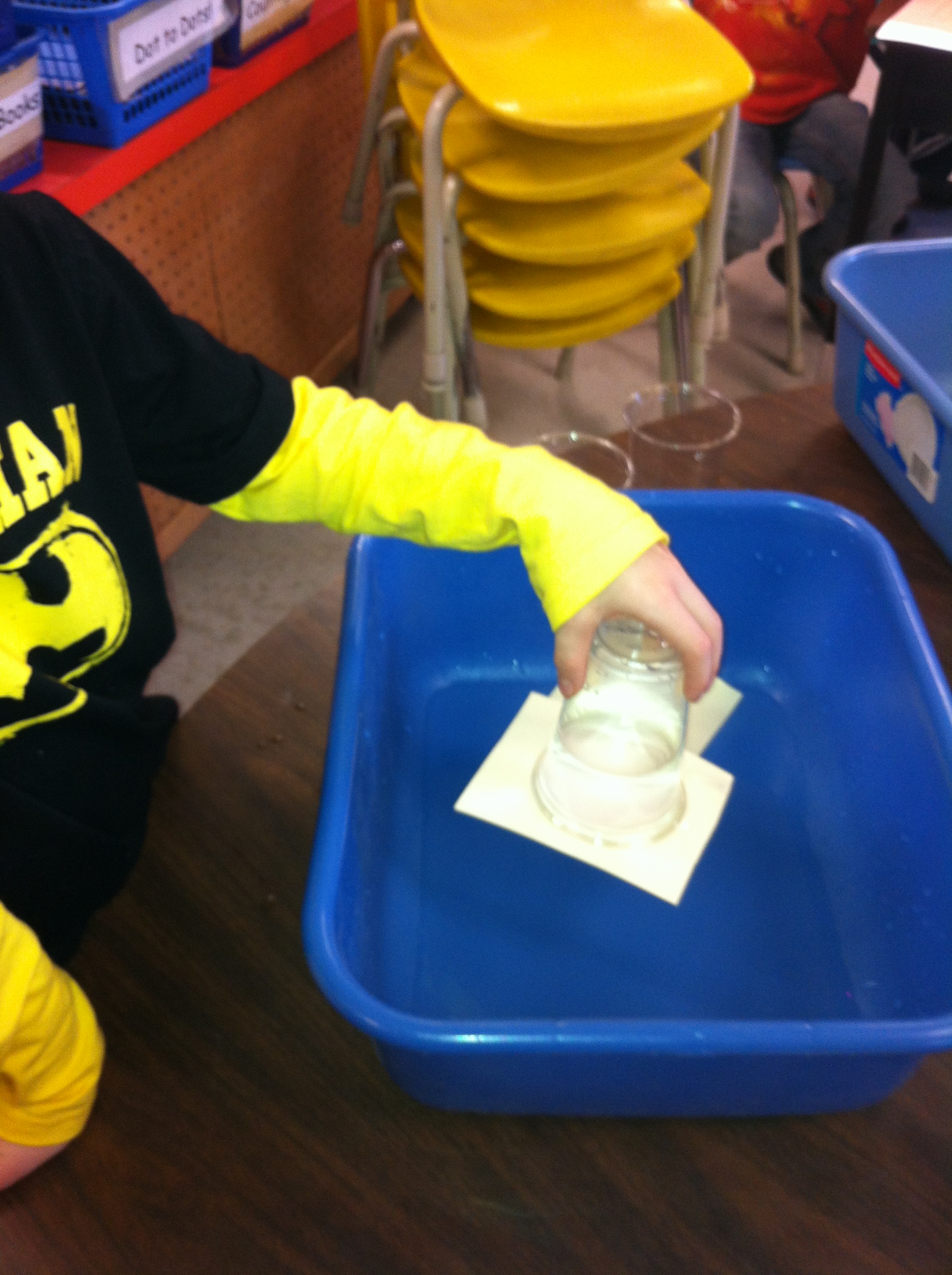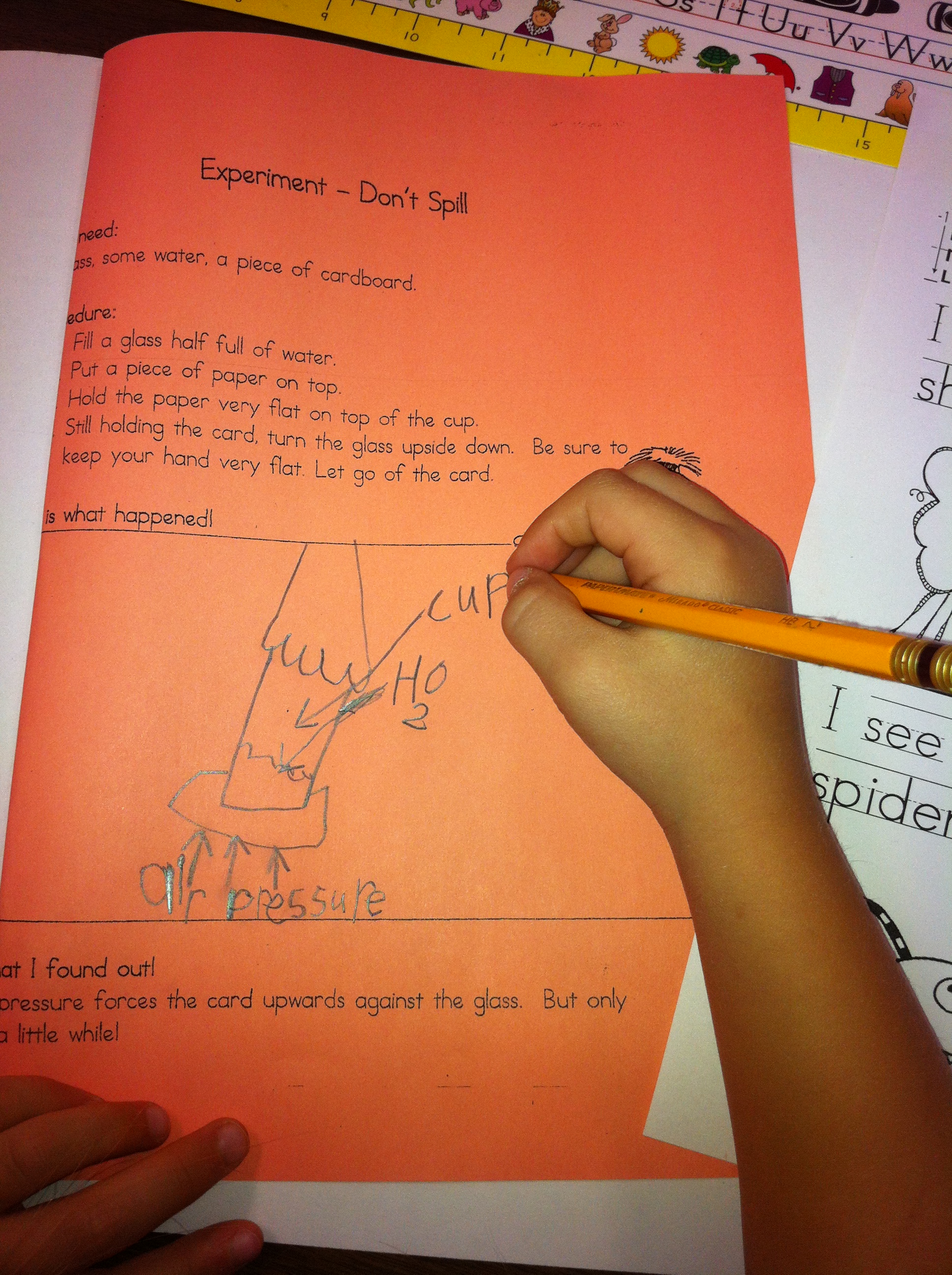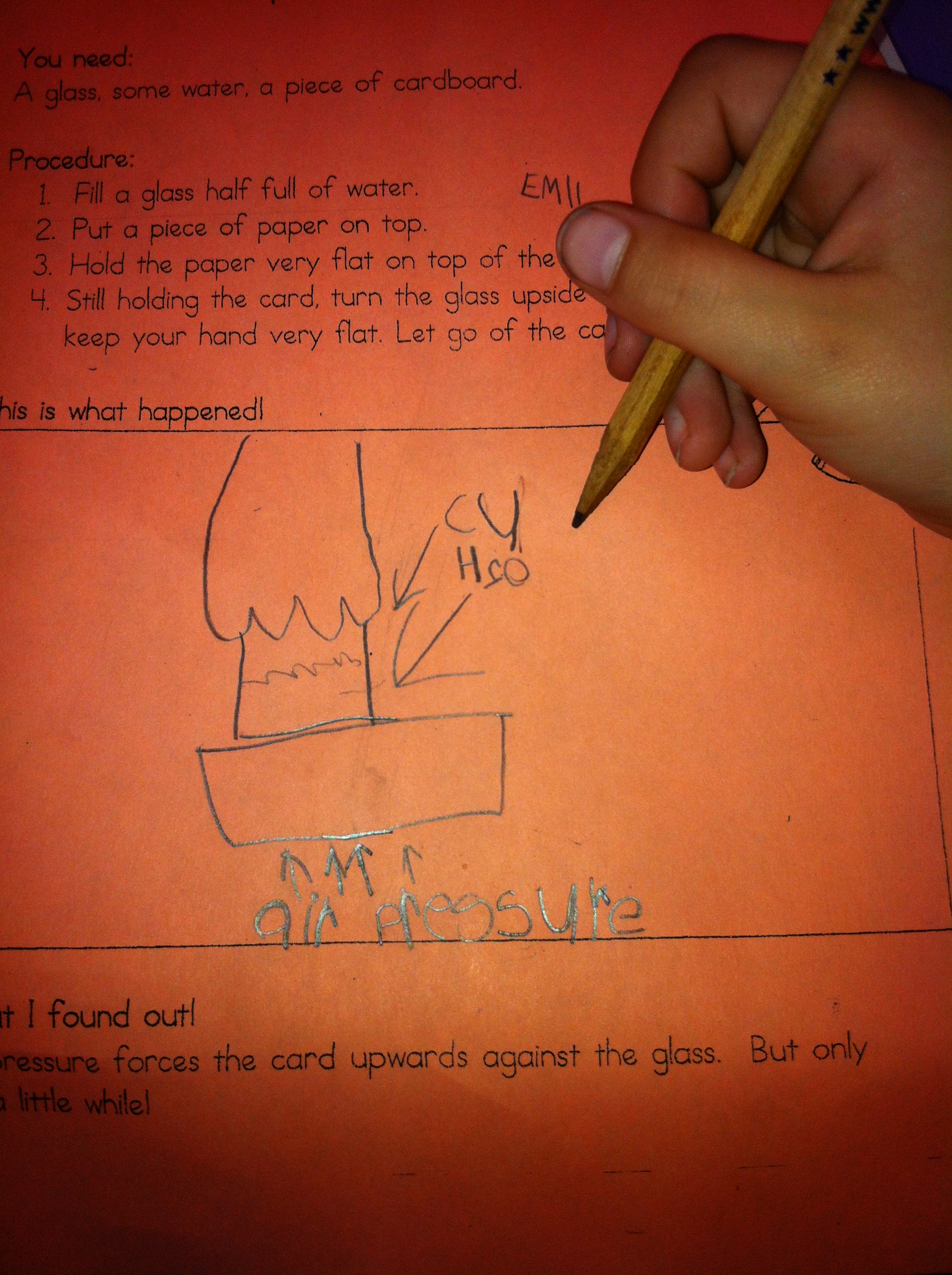 We talked about why the water stayed in the cup! One student’s water stayed in their cup for over half an hour! Eventually, the cardboard gets saturated with water and the seal releases. The children illustrated the experiment and labelled their drawing.