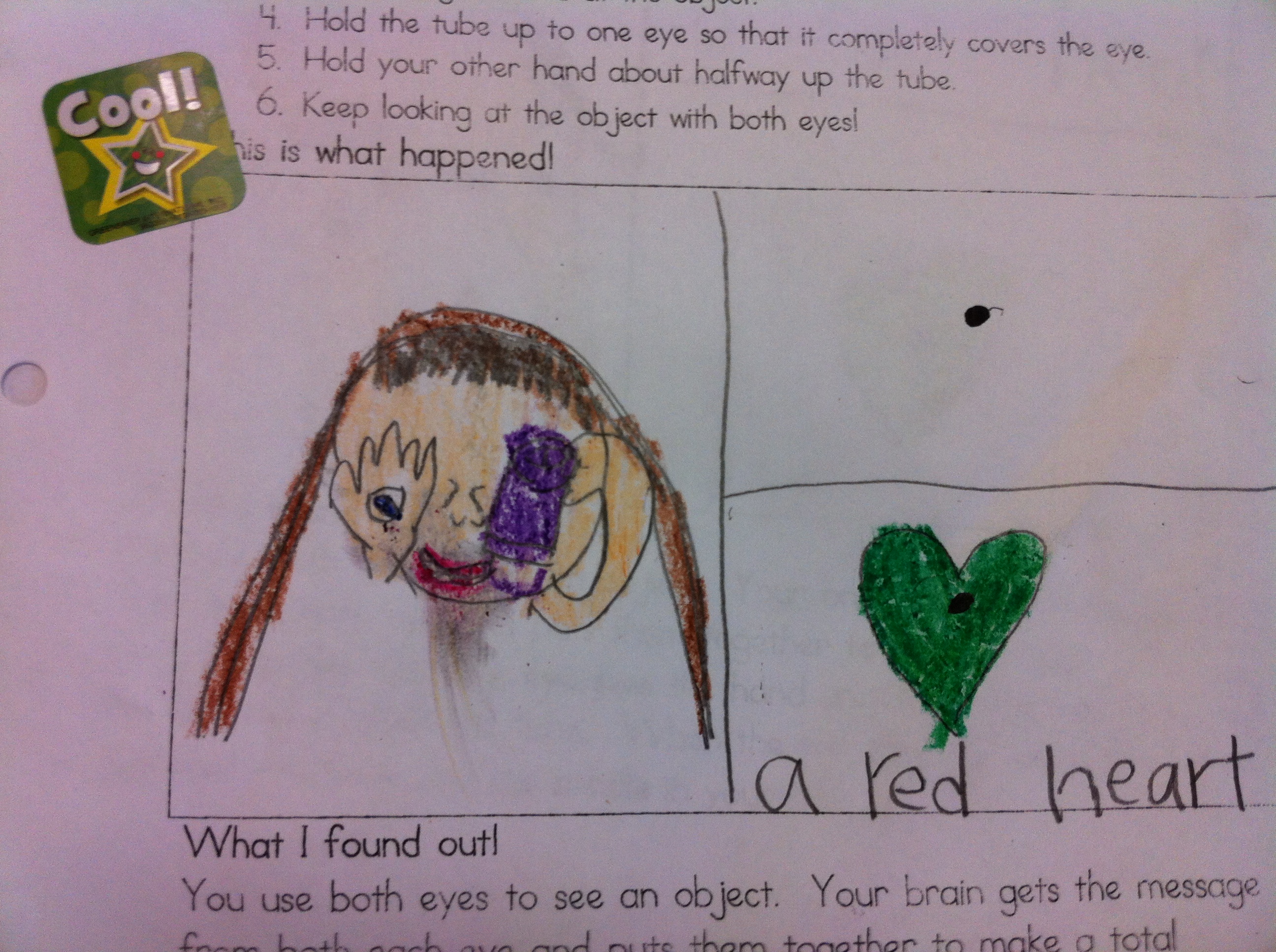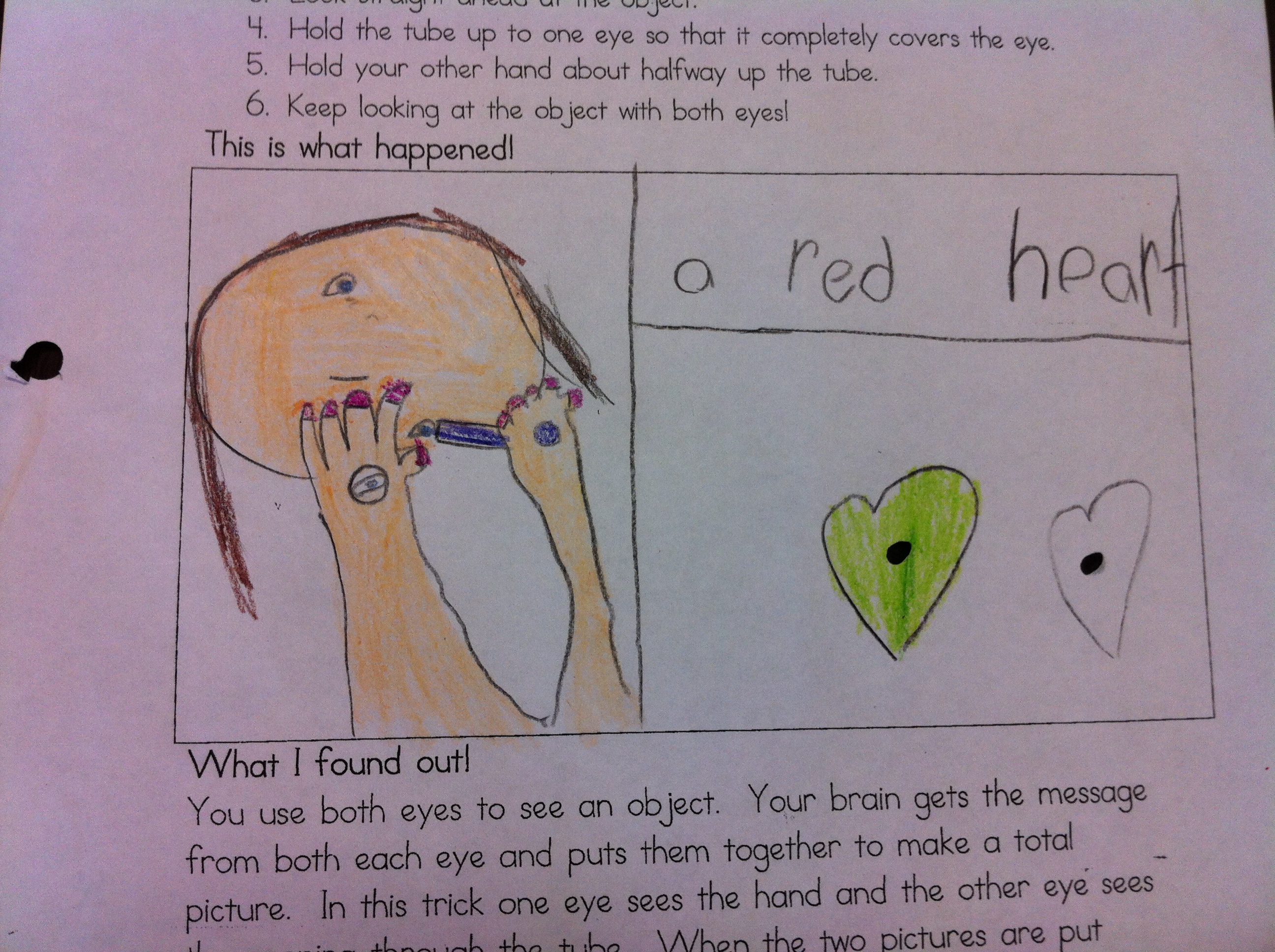 We did an experiment we call Hole in the Hand. The brain is tricked into thinking that you have a hole in your hand. We also had fun with playing tricks on the eyes with the Eric Carle book, Hello Red Fox. In the book, a little frog invites different animals to his birthday party. When he invites each animal the mother fox questions his perception of the color of the animal. He tells his Mom that she has not looked at his friend hard enough. The children look at the picture of the green fox with a small black dot in the center of the image and then after counting to 10 move their eyes to the next page and a red fox appears on the blank page! You can check out Eric Carle’s website to have him explain the exact way it works.