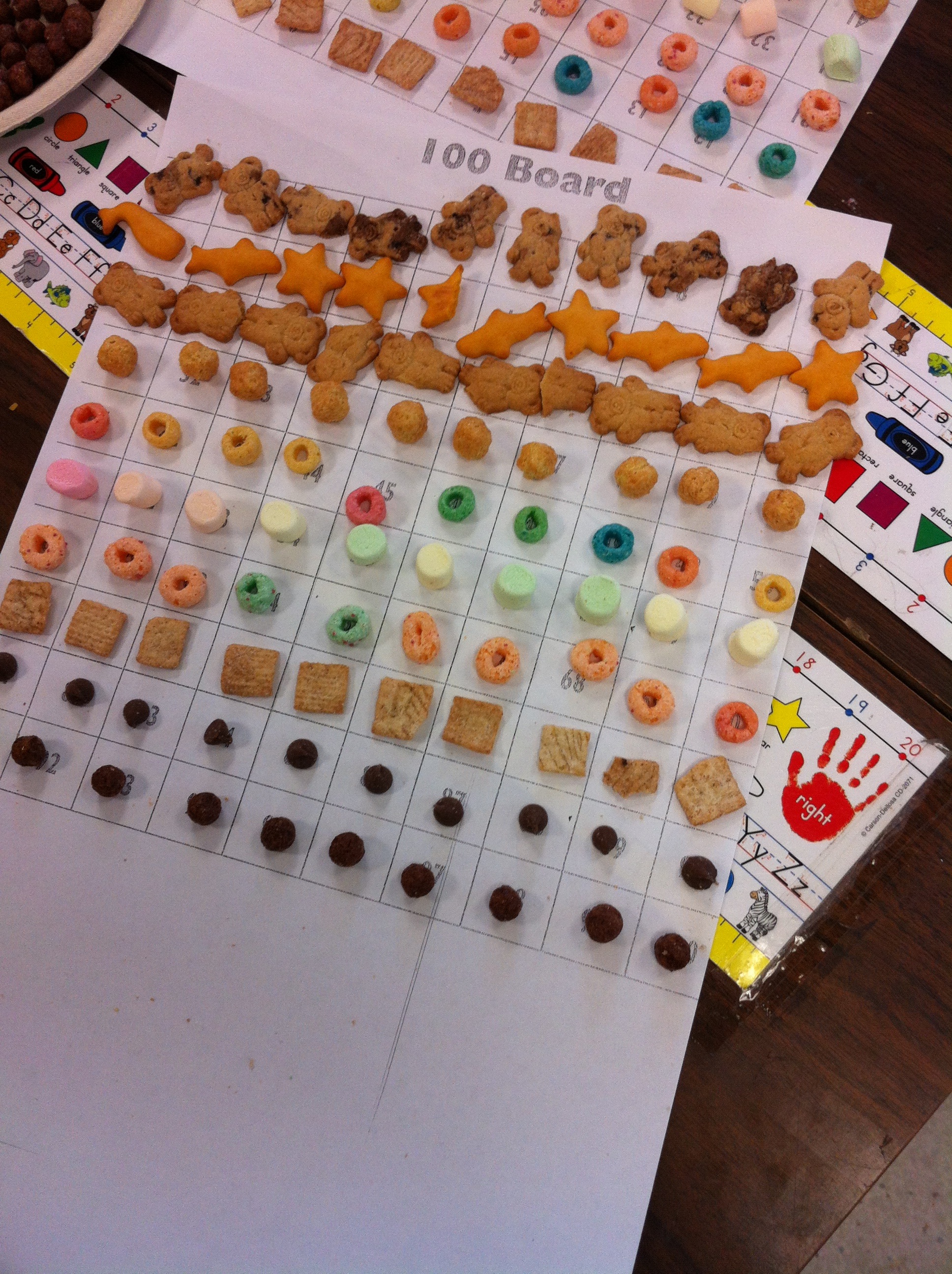 We made fruit loop necklaces by counting 10 Fruitloops into 10 plates and then threading them on a string! We also made a trail mix with 100 things. We checked our counting!