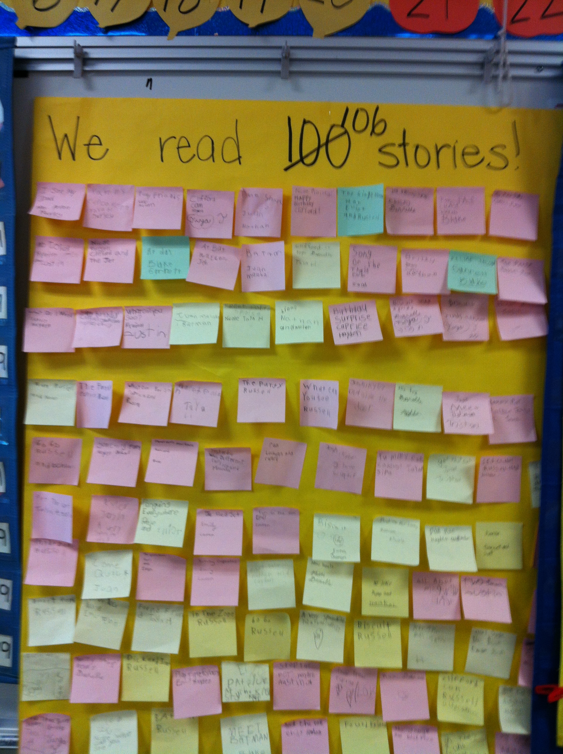 Working together we read 106 stories! The children worked as partners to read stories to each other and then recorded the title of the story and their names on a post-it. Lots of reading!