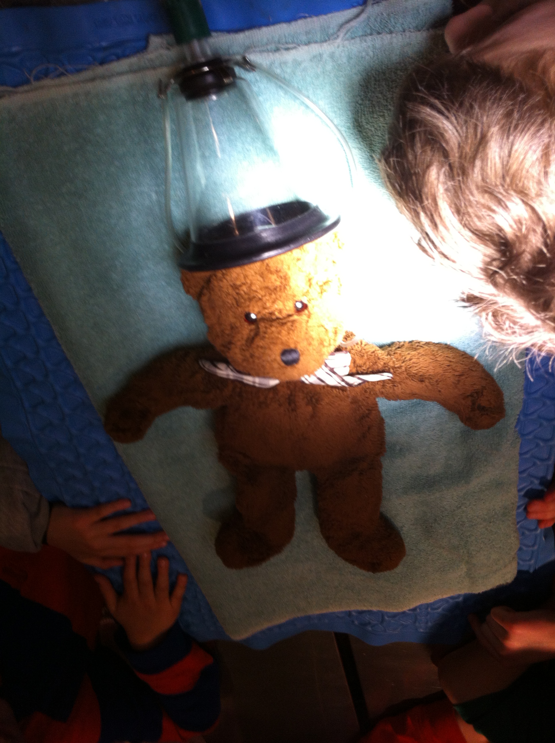 This teddy bear is laying on a special pad that keeps it warm during surgery!