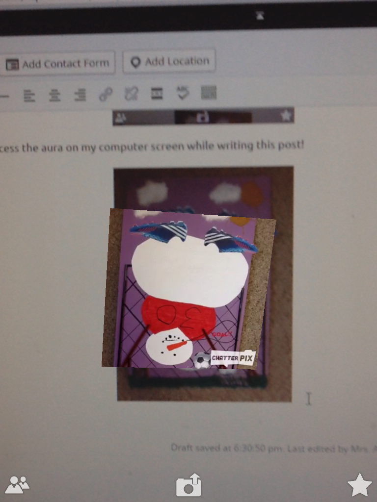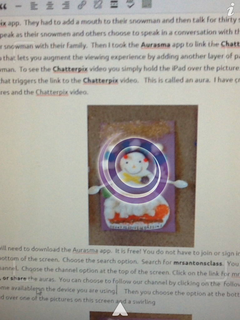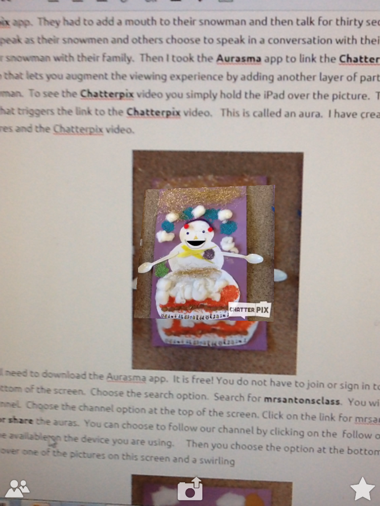 We have been having a lot of fun with the app Chatterpix! I took a picture of each of the snowmen and had the children bring their snowmen to life using the Chatterpix app. They had to add a mouth to their snowman and then talk for thirty seconds as if their snowman was talking. Some children chose to speak as their snowmen and others choose to speak in a conversation with their snowman. Some students preferred to talk about making their snowman with their family. Then I took the Aurasma app to link the Chatterpix video to their picture. Aurasma is an augmented reality app that lets you augment the viewing experience by adding another layer of participation to the object. In this case it is the picture of the snowman. To see the Chatterpix video you simply hold the iPad over the picture. The picture is now the trigger image within the Aurasma app that triggers the link to the Chatterpix video. This is called an aura. I have created auras for each of the snowman pictures linking the pictures and the Chatterpix video.