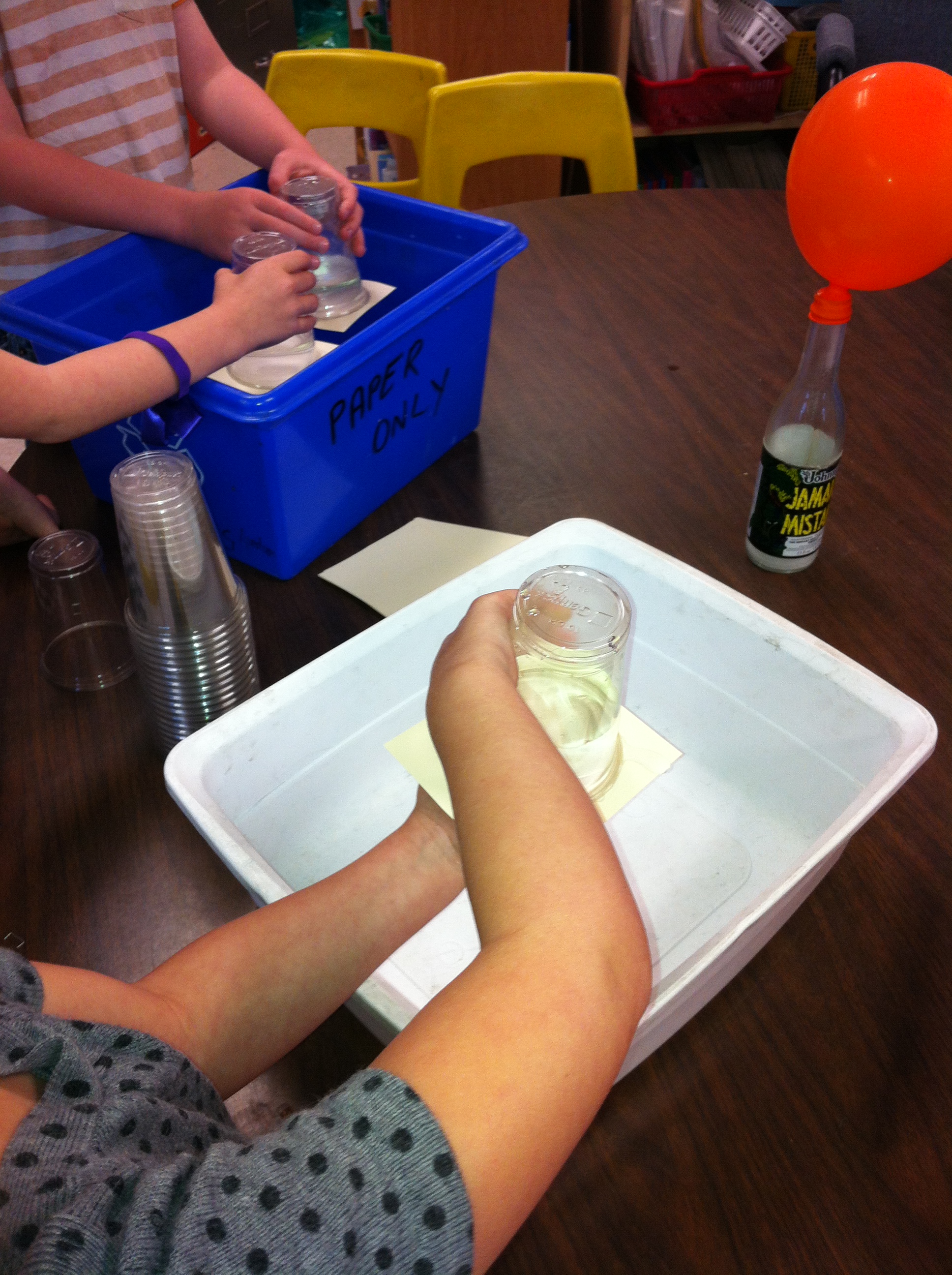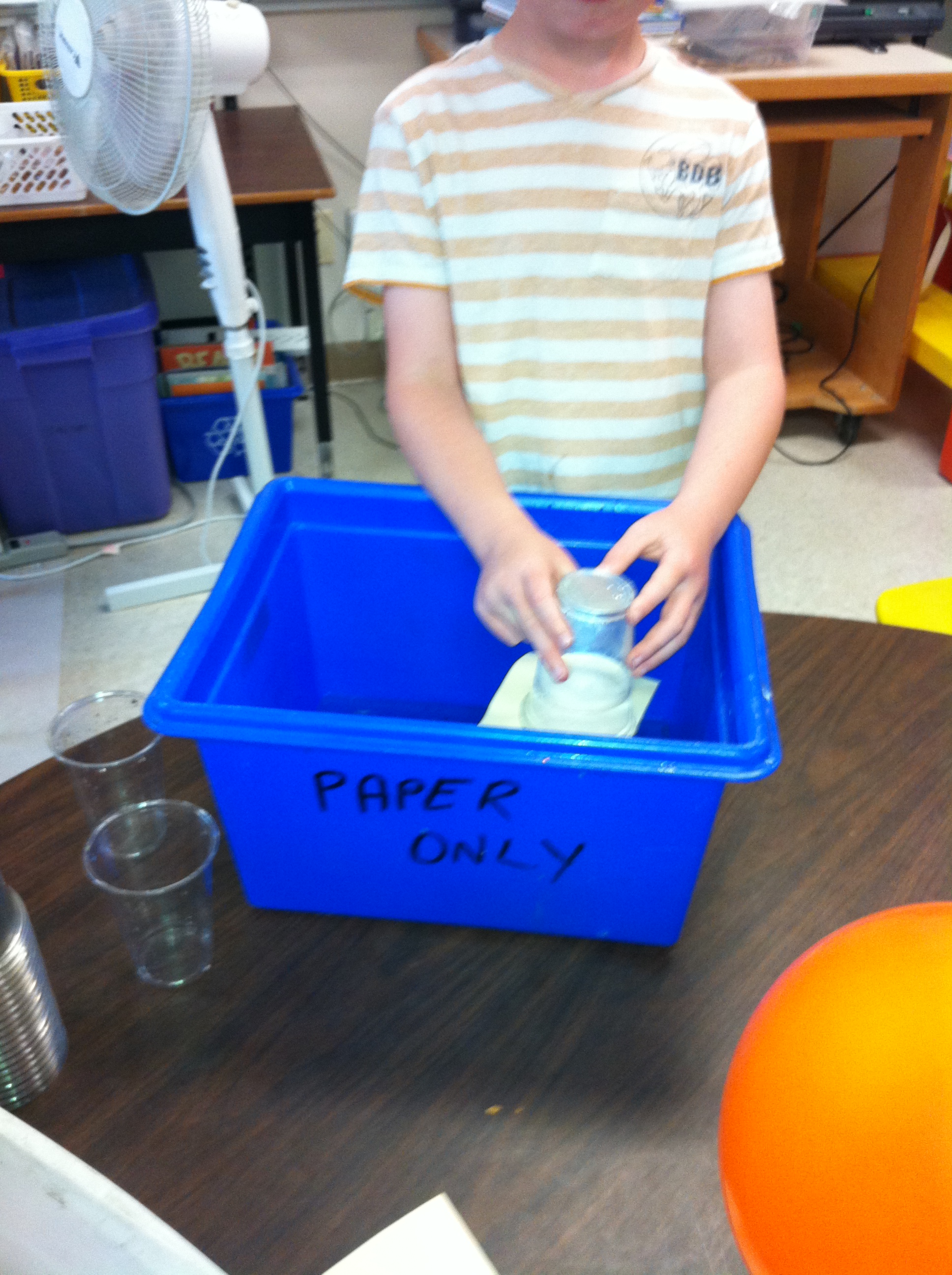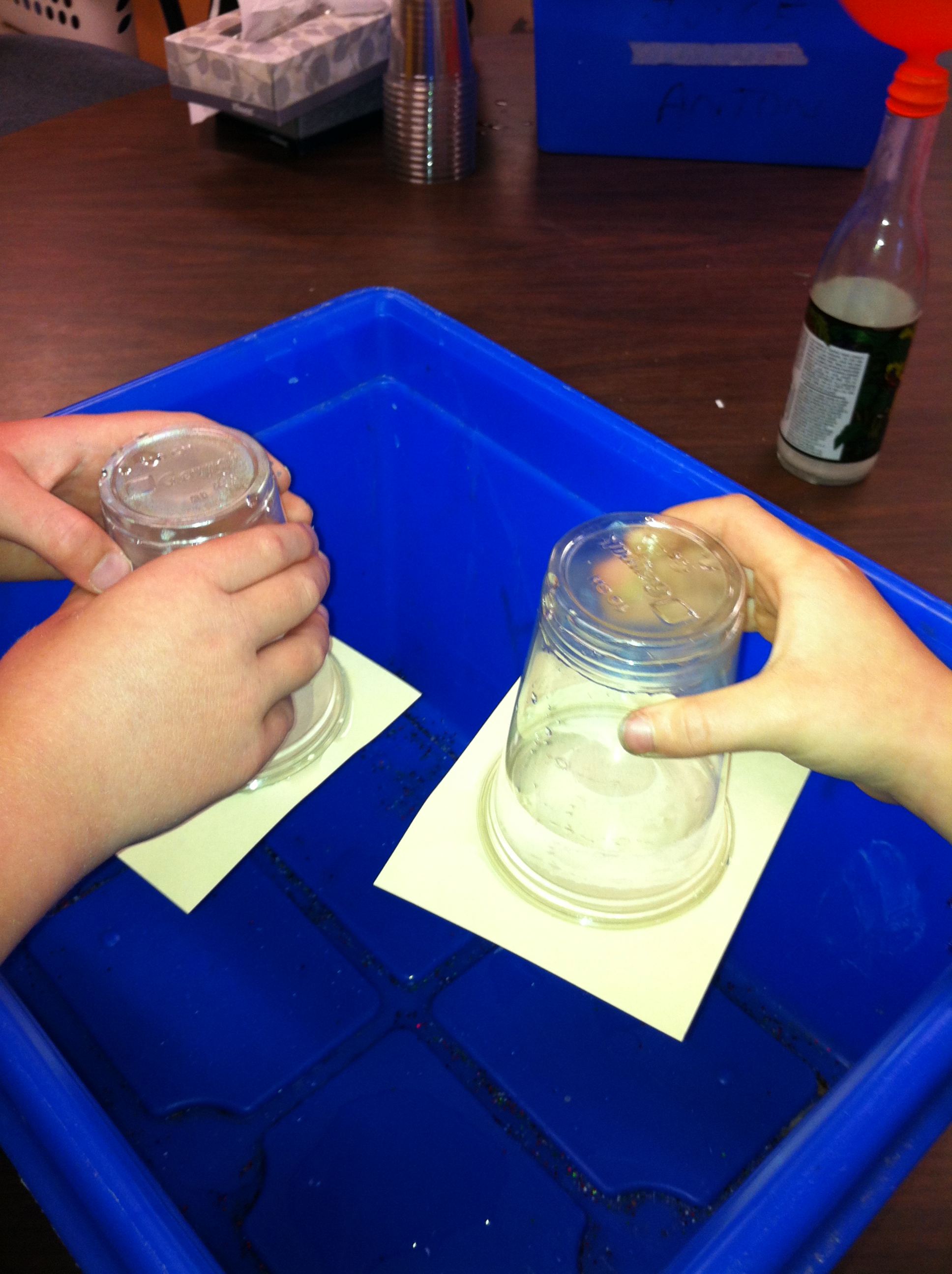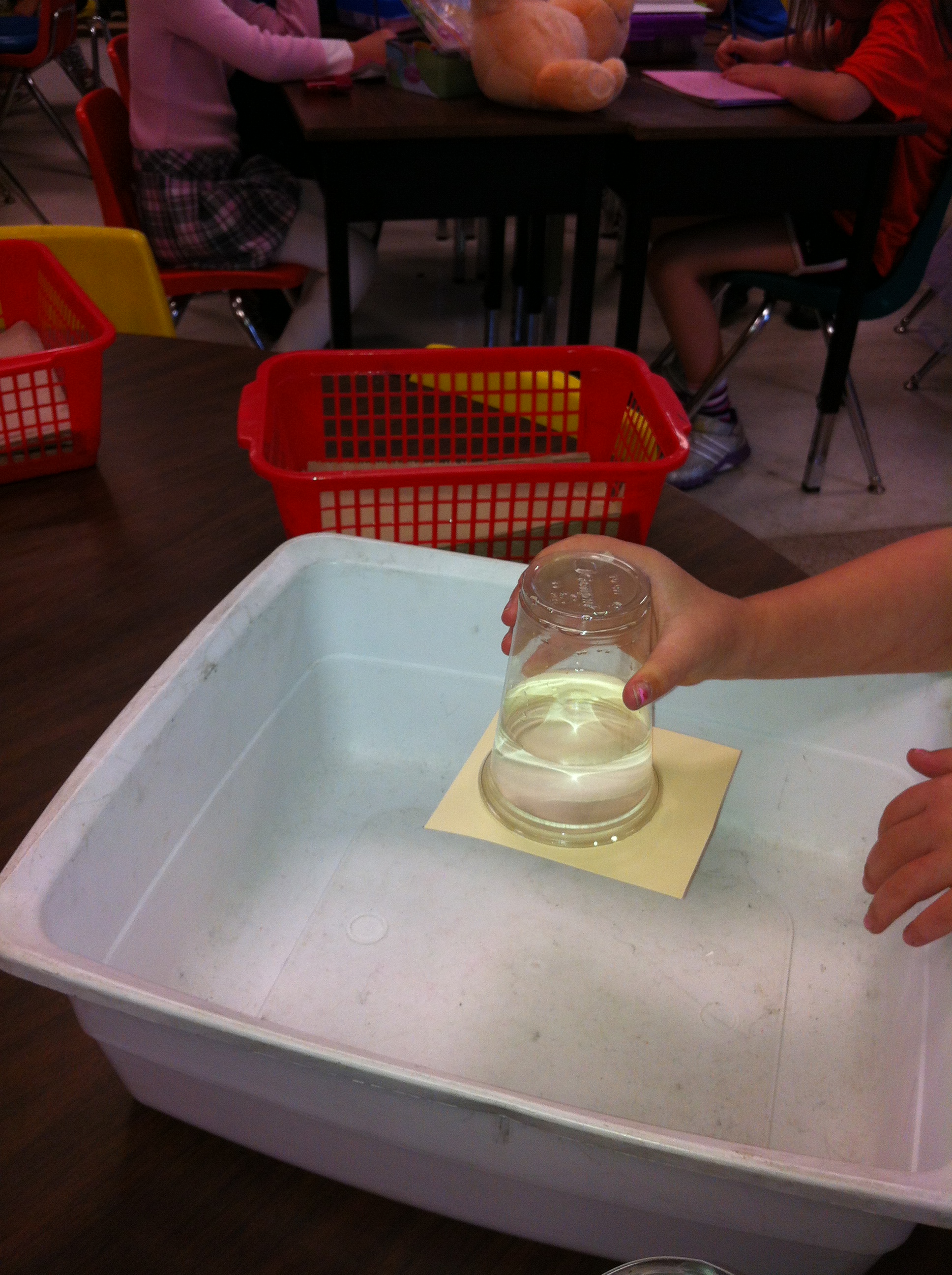 We also repeated the Don’t Spill experiment.   It is fun to watch their faces when the piece of paper holds up the water in the upside down cup for a while.  I think the record this morning was just a little over half an hour before the paper fell down and the water splashed out!