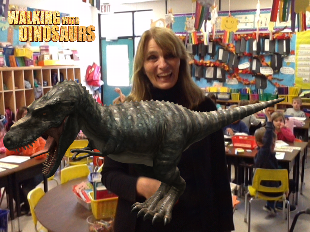 We had some fun today with a new iPad app I found called Walking with Dinosaurs!  It is another Augmented Reality app that is amazing!  We played with the Photo Booth aspect today.  The app allows you to pick from a variety of dinosaurs, orient them on a screen and then take pictures with the dinosaur!  We had some fun by posing and acting out a variety of situations.