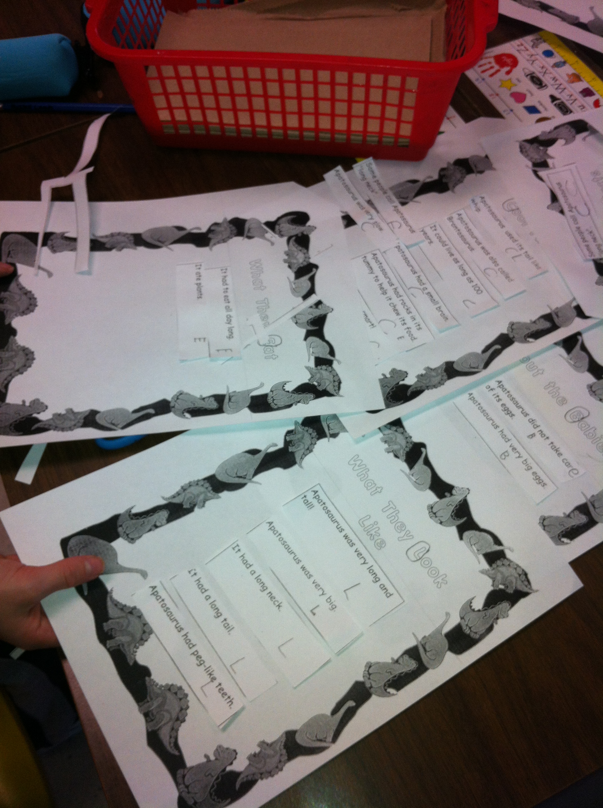 The children glued the facts onto the correct category sheet and we created our dinosaur reports!