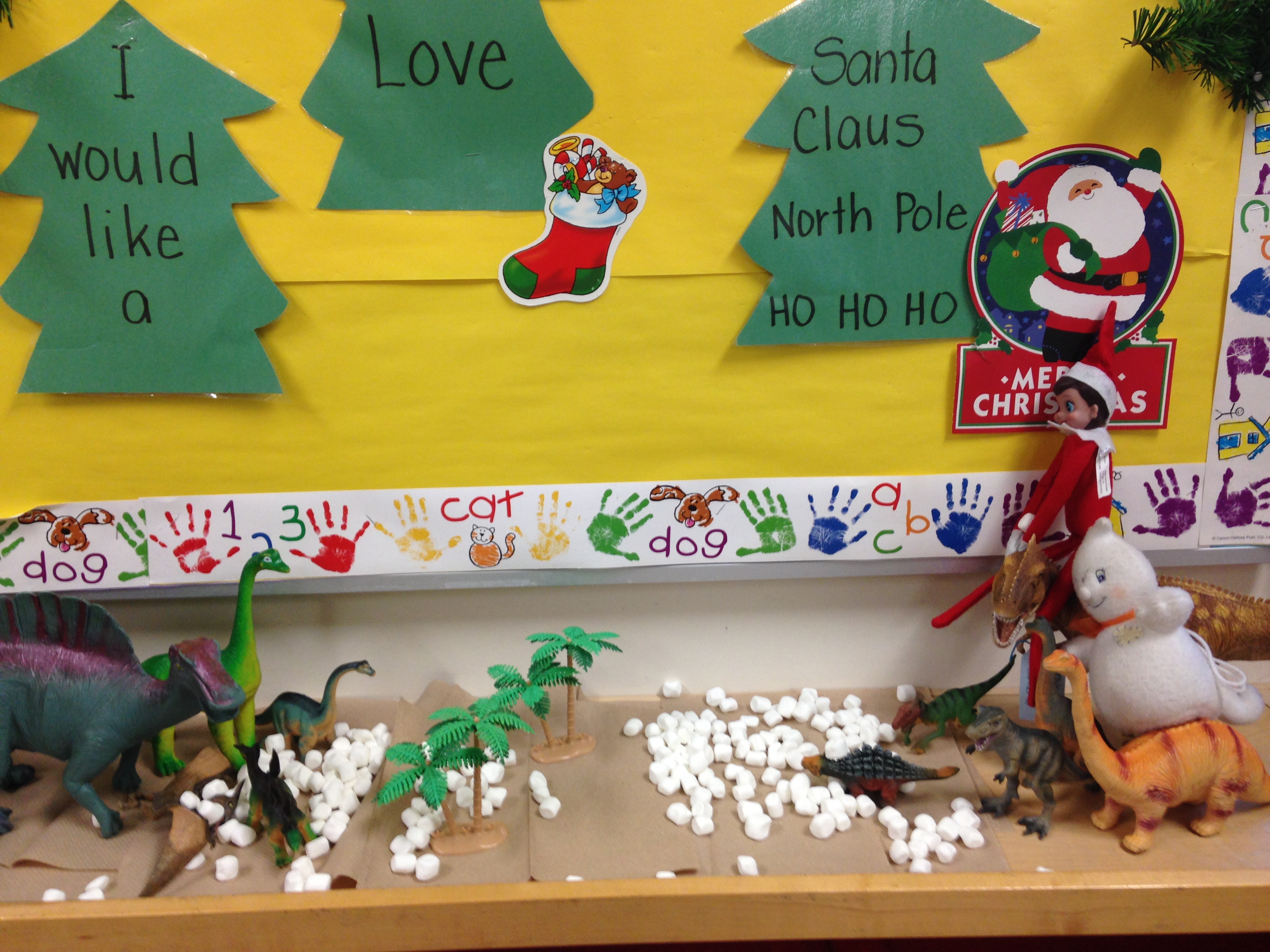 Sparkles, our Elf on the Shelf is back this year and started her visit with a snowball fight with the dinosaurs in the classroom. The snowballs were miniature marshmallows! Of course,we had to eat up the marshmallows to prevent further fights.
