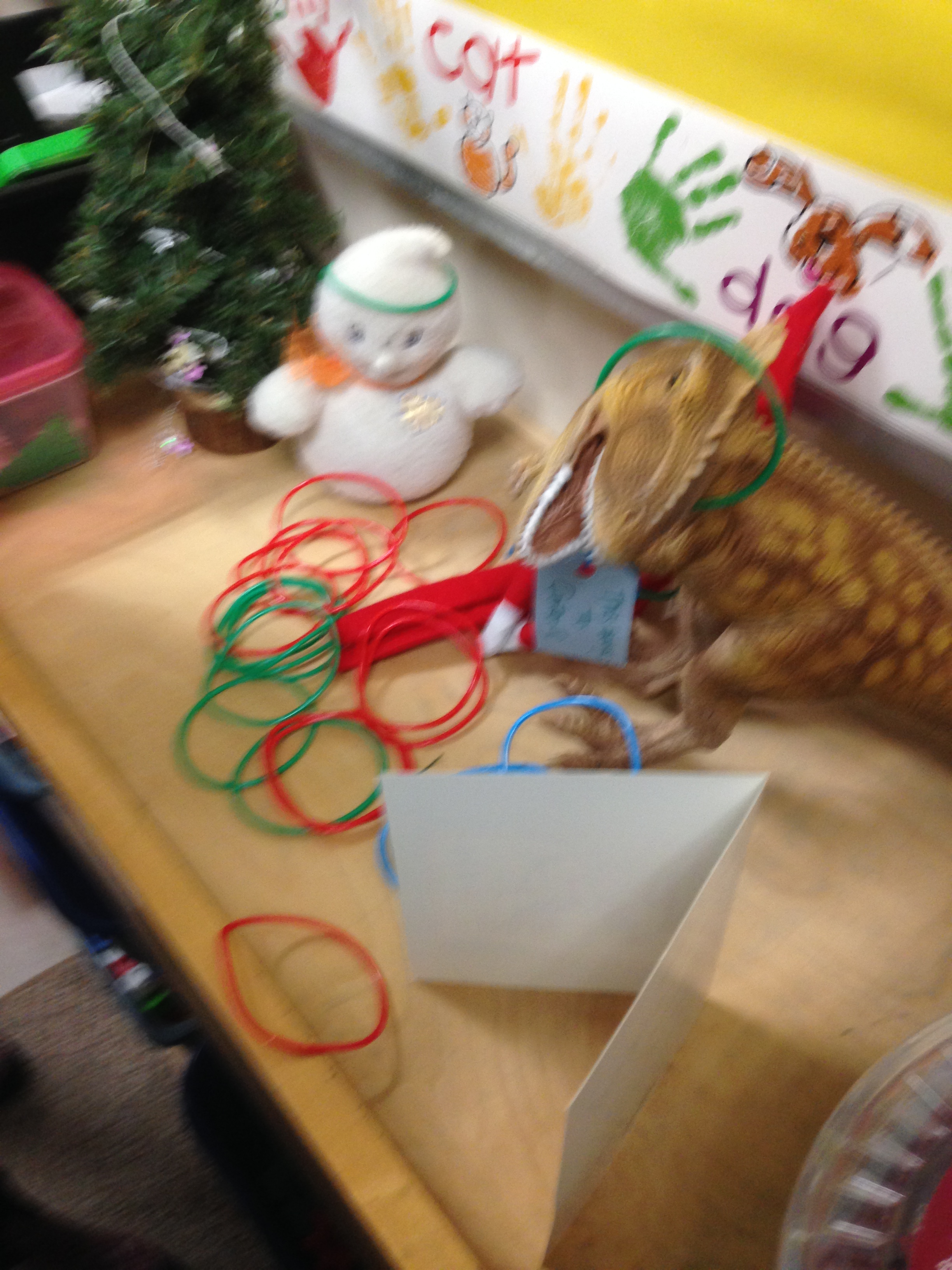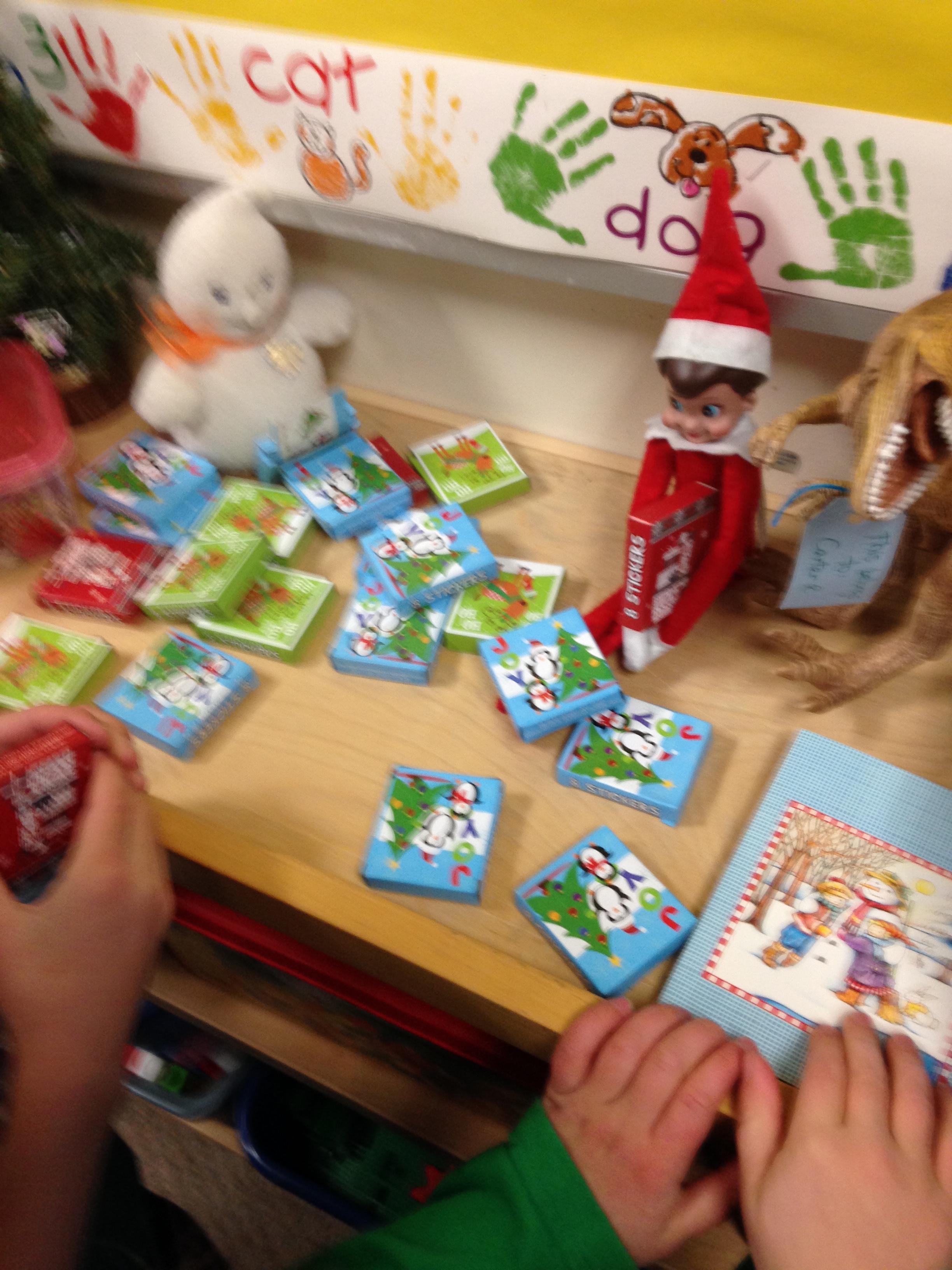 The Elf and Gus have been having a good time in our classroom. They decorated a little tree and decided to read Christmas stories on Wednesday night. They left some Christmas confetti to play with too. We are trying to record what they are up to each day in our little booklets about their adventures.