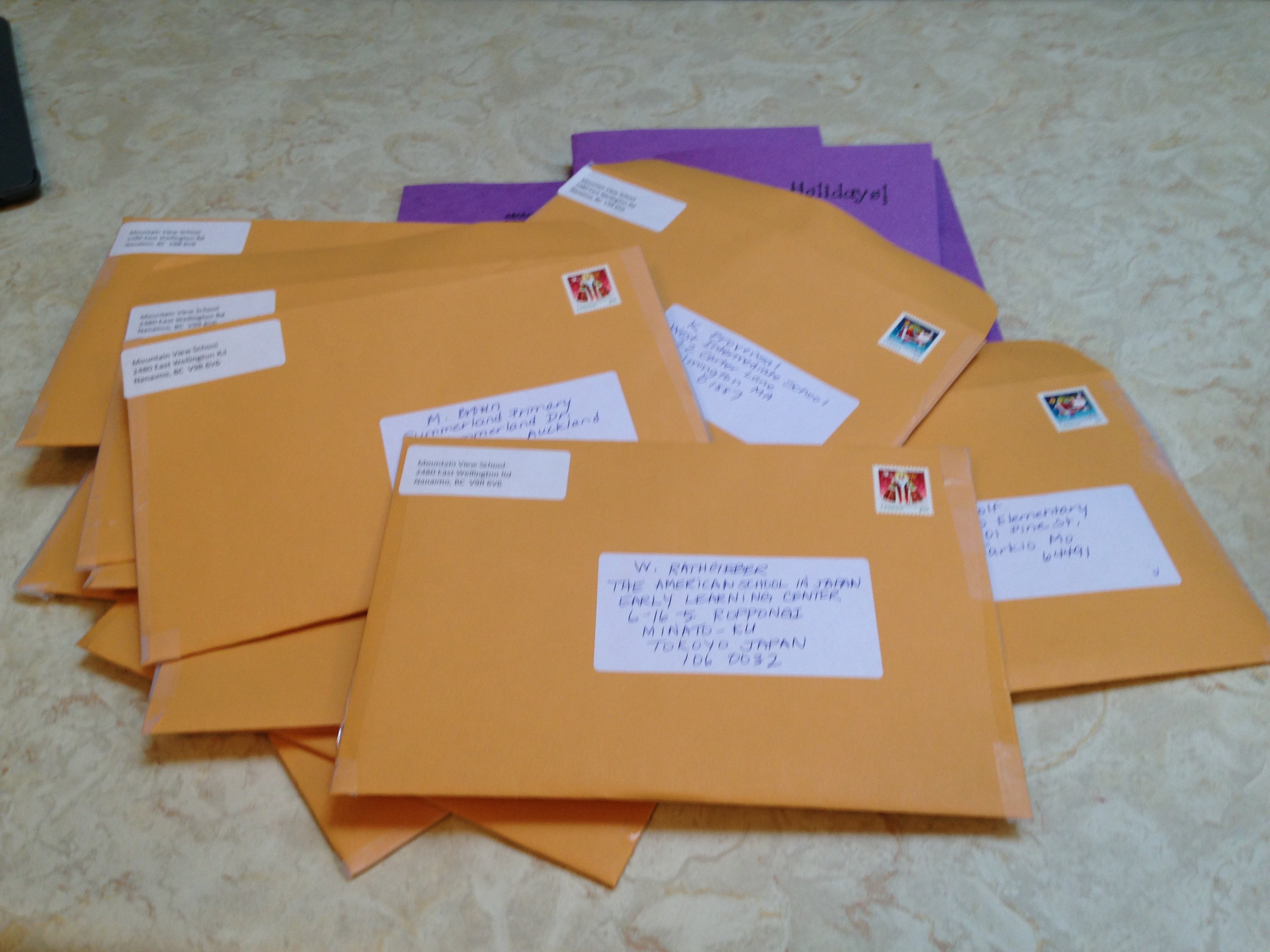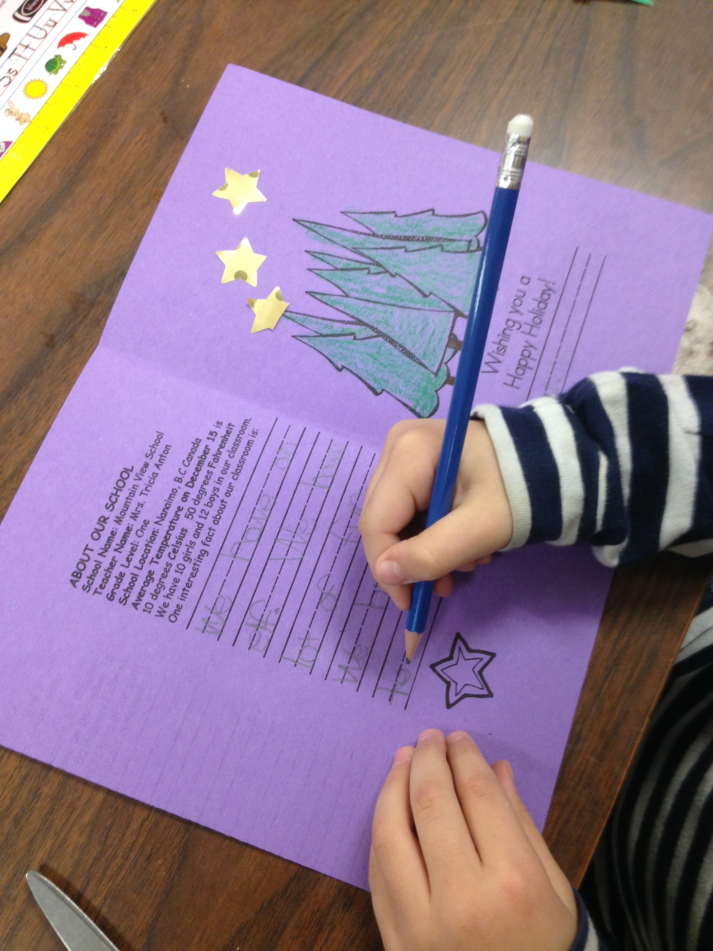 We have been having a great time making Christmas cards to send to 30 other classrooms from around the world. We are taking part in the Holiday Card Exchange with over 1,100 other classes in the world. This project is organized by a lovely lady in California named Jennifer Wagner. We have to make 30 cards and send them to the 30 names on our list. We will be receiving cards back from all the names on our list! We took part in this project last year and it was very exciting. This year we have cards going to Kenya, New Zealand, and Japan. We have cards going to five places in Canada, and lots of cards going to a large variety of places in the United States!