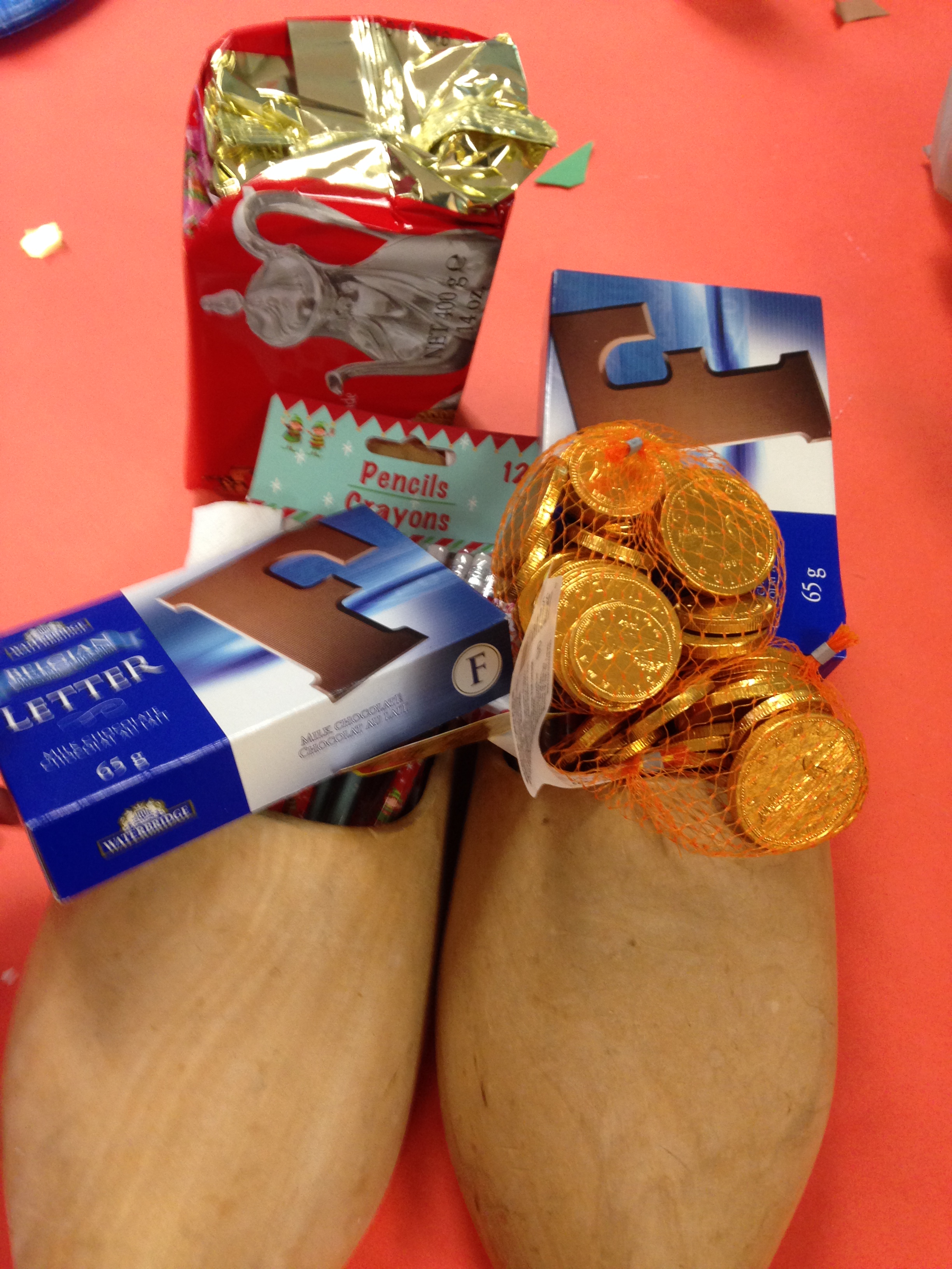 Today Sinterclaas left a treat for our class. I am a first generation Canadian as my parents emigrated to Canada in 1952. We brought some customs that we still celebrate today! One of my favourites is Dutch Christmas. So, today I brought my wooden shoes to school. The children learned to count to 10 in Dutch and say Merry Christmas. Sinterclaas must have noticed because when we put my wooden shoes outside our classroom door, Sinterclaas came! He brought little treats for the children along with special gingerbread cookies called speculaas, some gumdrops, and chocolate letters. Lots of fun.