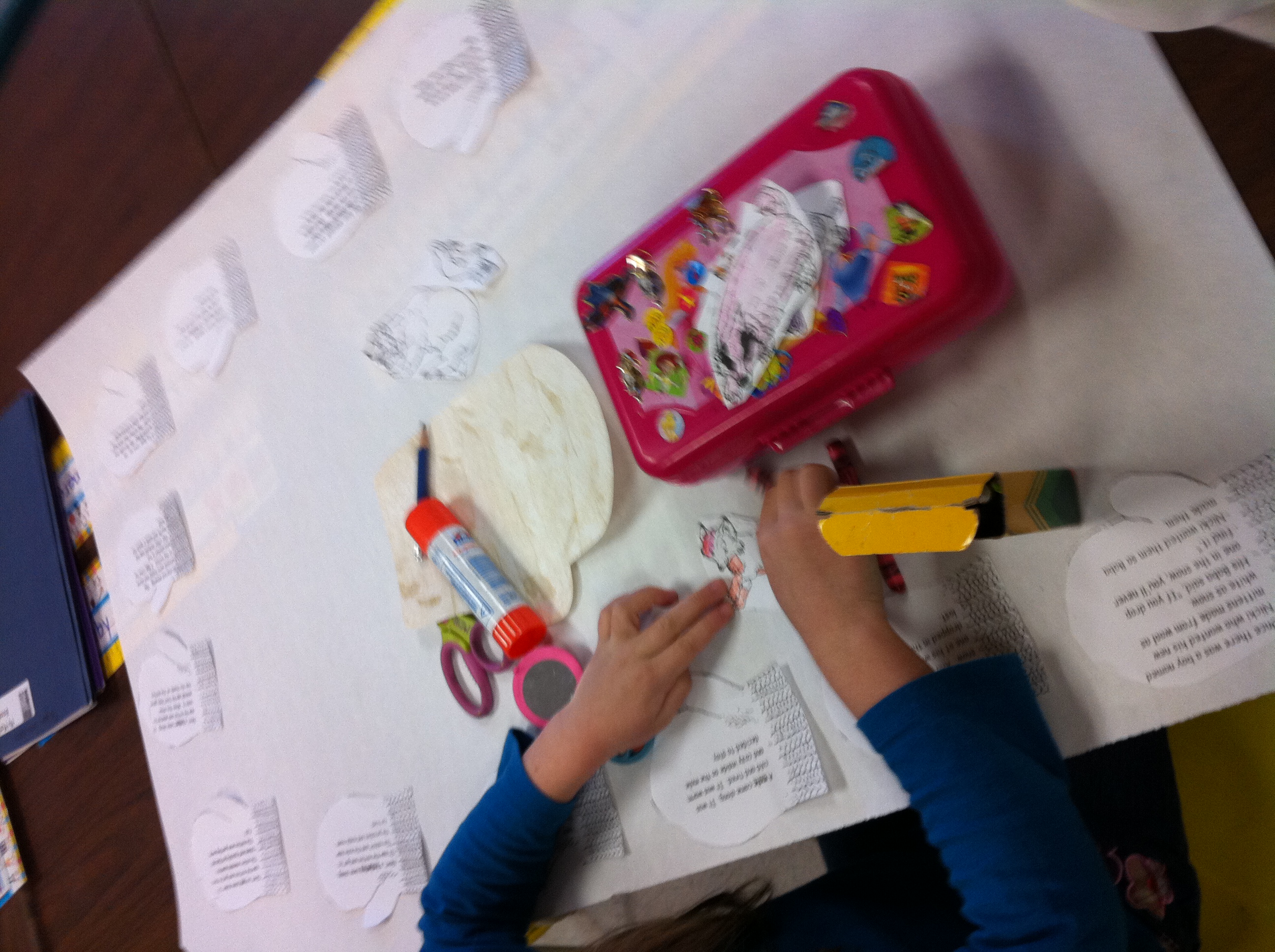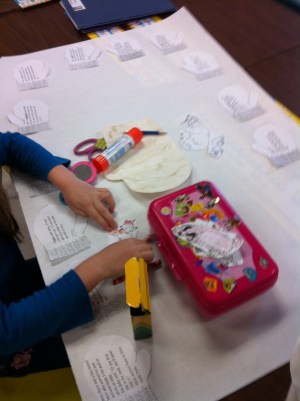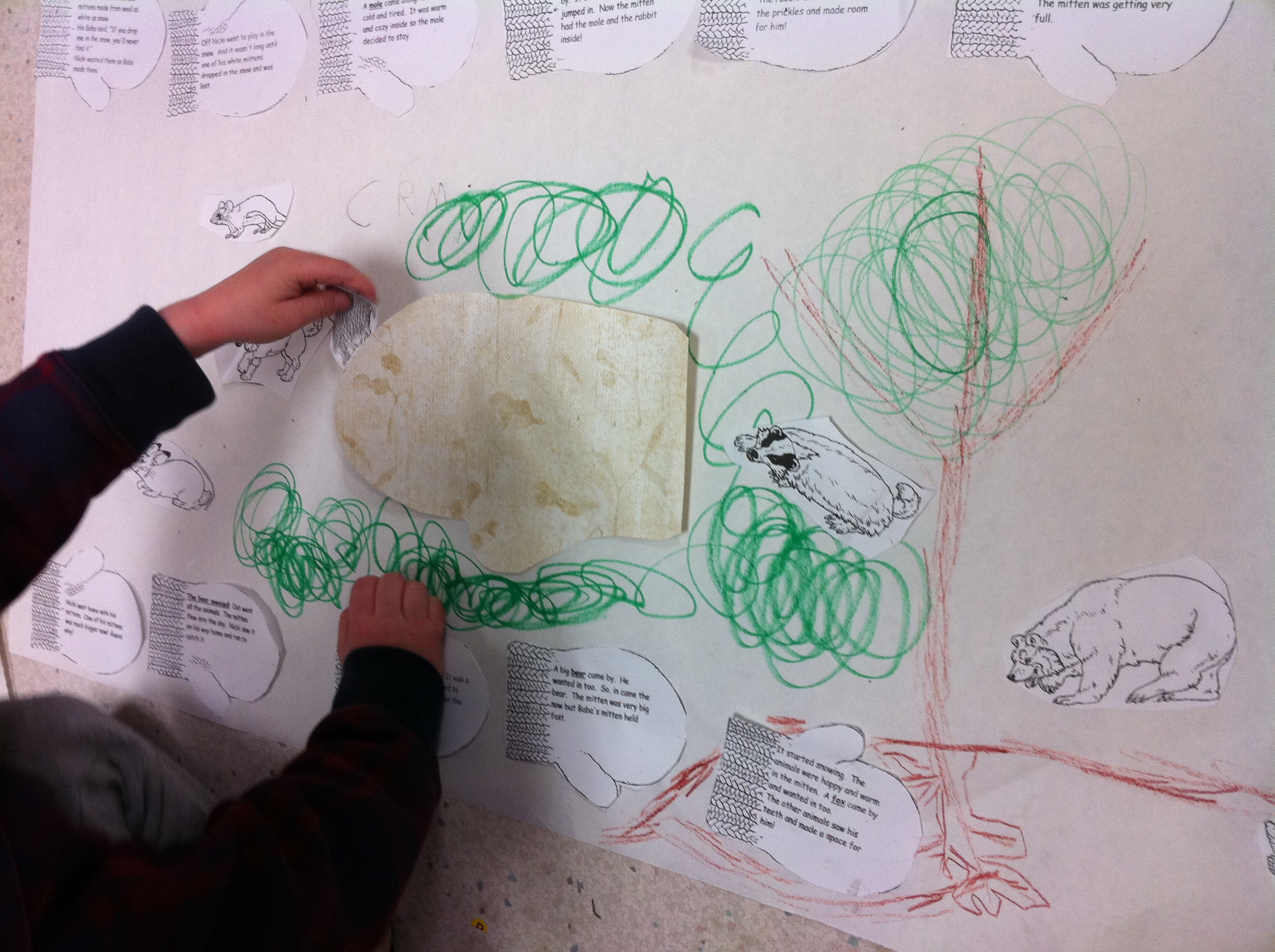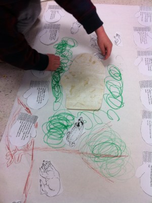 Today we read the story The Mitten by Jan Brett. We have been very successful making it snow this year by reading snow stories and doing snow art. Every time it has started snowing we have been helping it along with great results! When it started snowing this morning we couldn’t resist working our magic once again! We made a story map to go along with our story! Each mitten contained a part of the story. The children read the parts and put them in the correct sequence. We then put a mitten in the middle of our “snow” that the animals could snuggle into by hiding an envelope behind a wallpaper mitten that was camouflaged in the snow. We also read The Hat by the same author at storytime today. Jan Brett has a great website. It has some fun things for children to do.