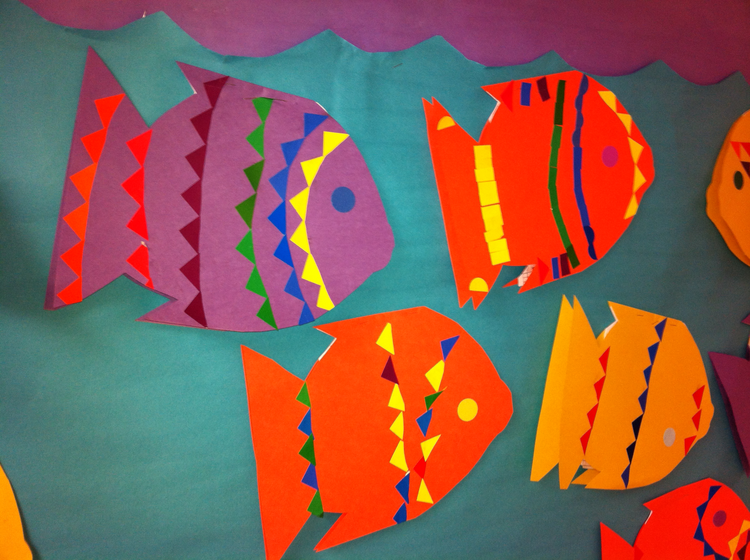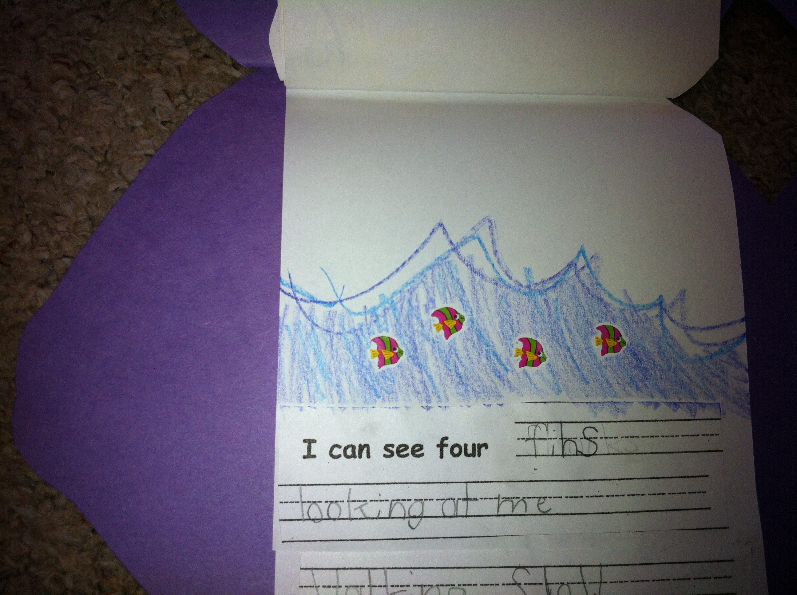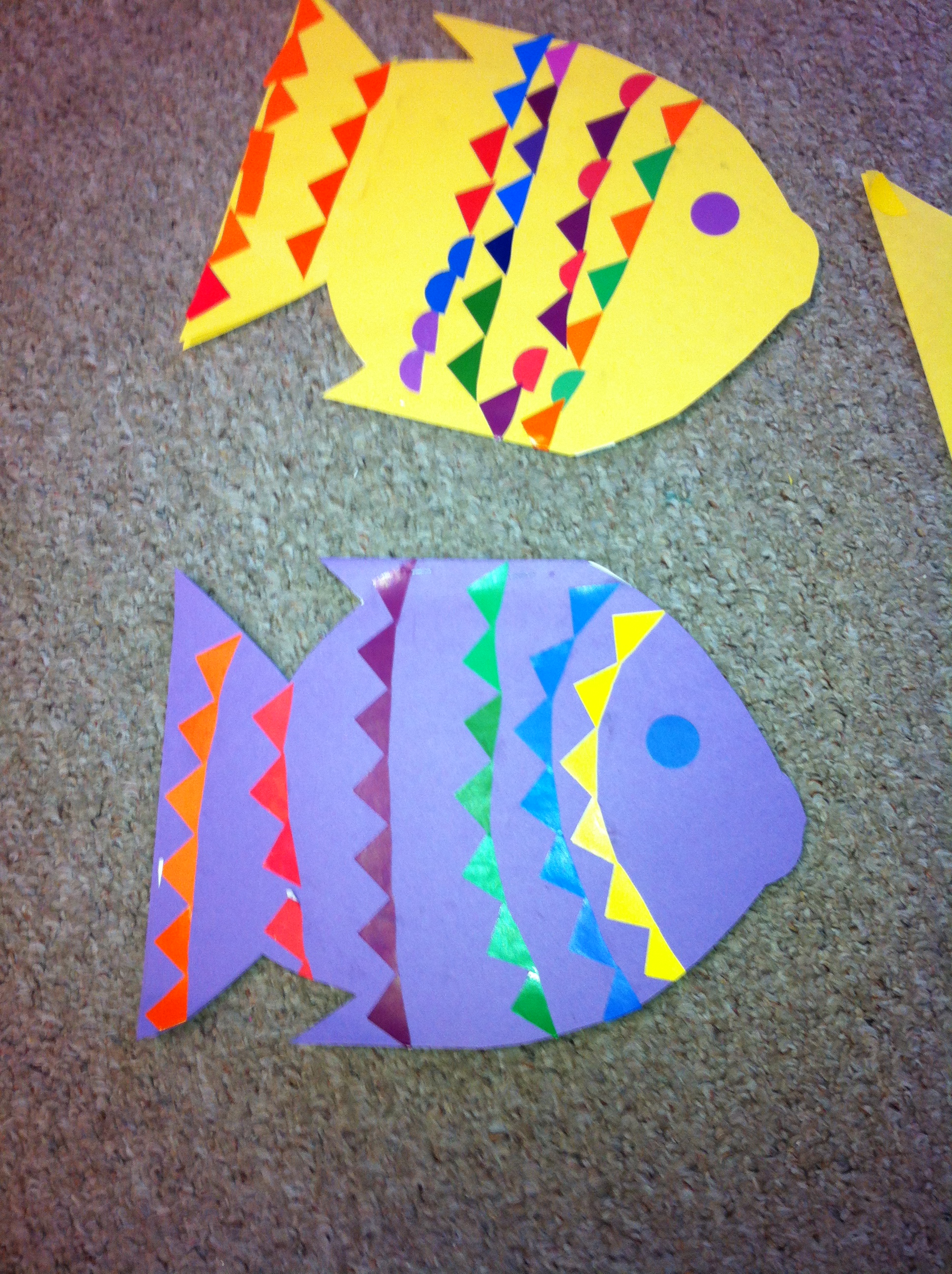 We watched the story Swimmy by Leo Lionni! In the story, Swimmy works with other little fish who are in danger of being eaten by some big fish to create the illusion of an even bigger fish. Swimmy becomes the eye of the fish and the other little fish form the body of the fish by swimming in formation. The big fish run away in fright!
