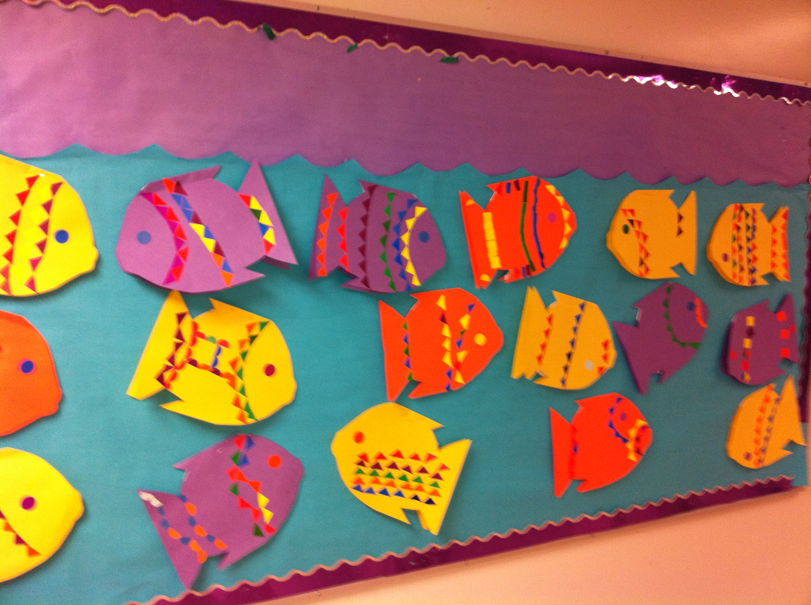 We are continuing to work on our mini ocean unit. Take a look at the fish we made using our hand prints! It was a little ticklish painting our hands but they turned out really well. We worked with shapes to make the striped fish. Lots of circles, triangles, rectangles, and so on. We made two hand print fish. We used one for our fishy quilt. The other one we used for this….