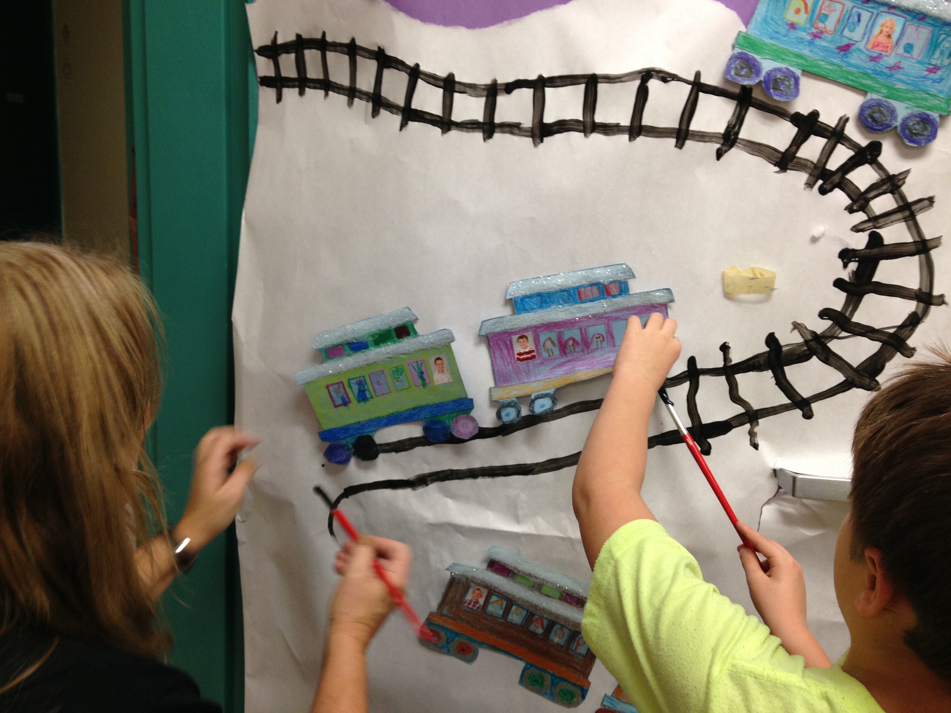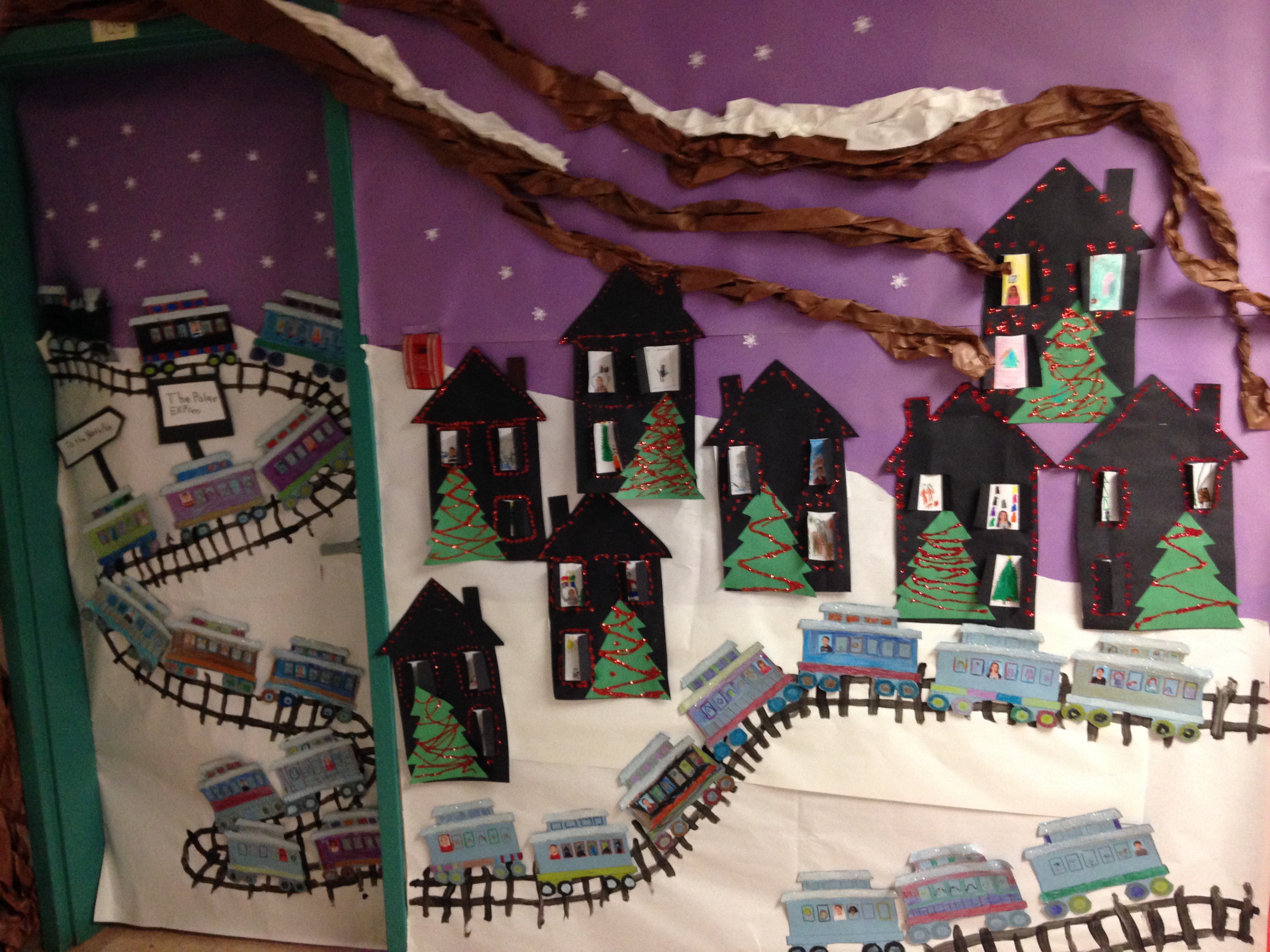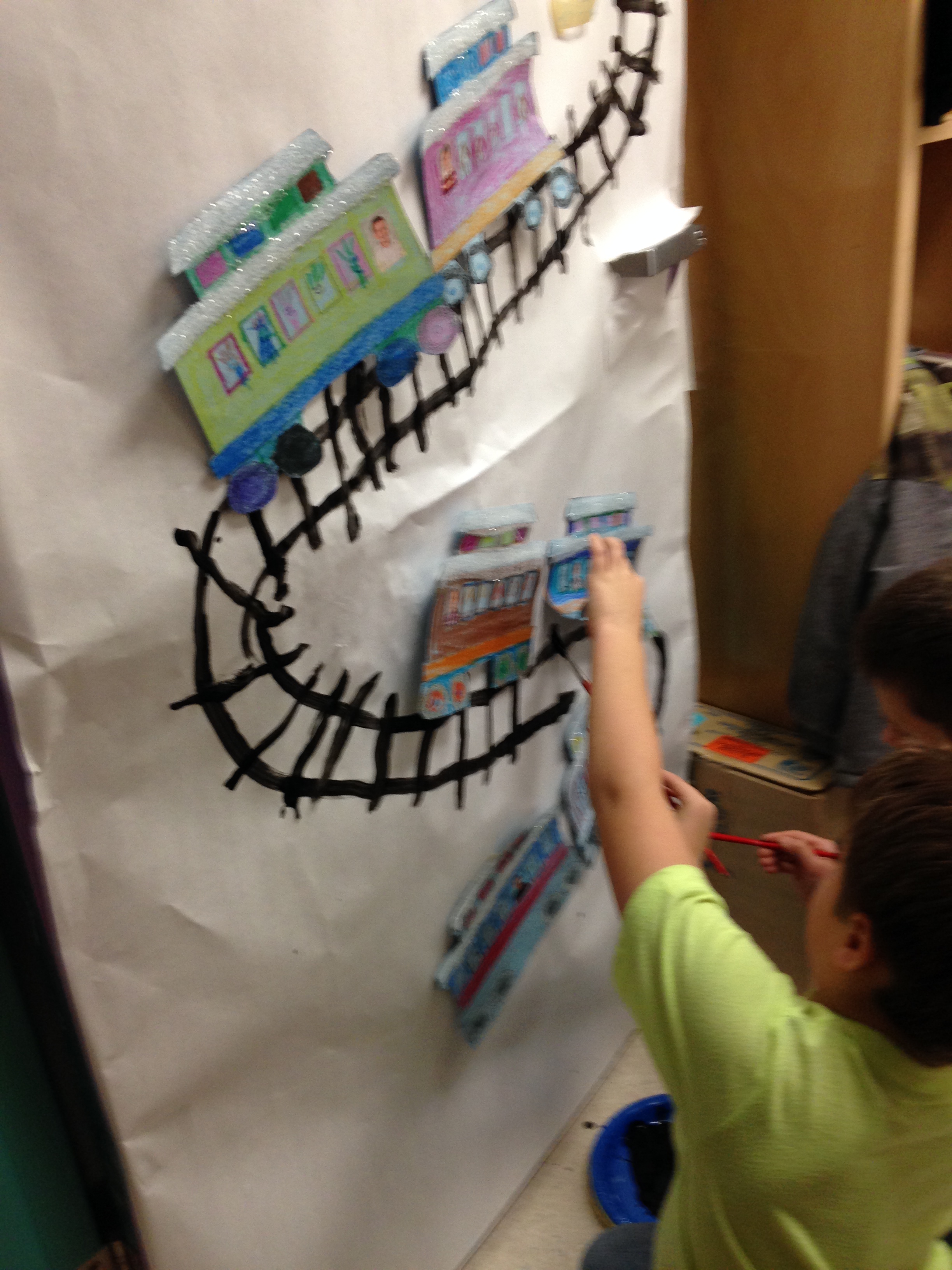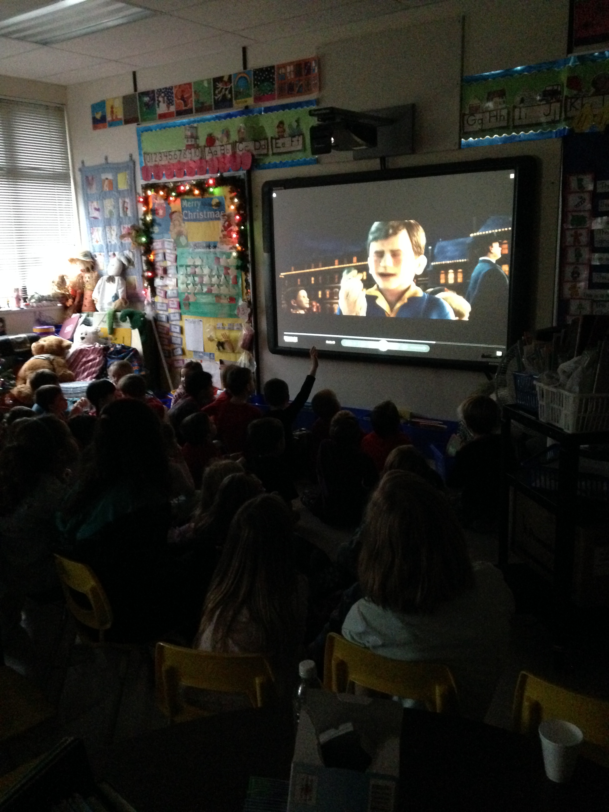 The other Grade One class joined us aboard the Polar Express with some very special Polar Express tickets! We had a great time together. We had hot chocolate with mini marshmallows and lots of amazing treats just like on the Polar Express. Thank you to all the parents who helped supply all the goodies this time! The two groups gathered on the carpet to watch the movie The Polar Express in the afternoon. It was a real treat to see it on our new Promethean board!