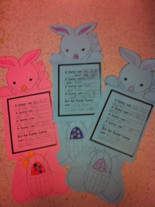 We had a great time learning about rabbits these past few weeks. The children did a great job on their rabbit reports! We read and sorted the facts about rabbits into four different categories. The categories were What They Look Like, About the Babies, What They Eat, and Cool Facts. The children glued the facts onto the appropriate category page and then we turned the report into a rabbit! They did a great job!